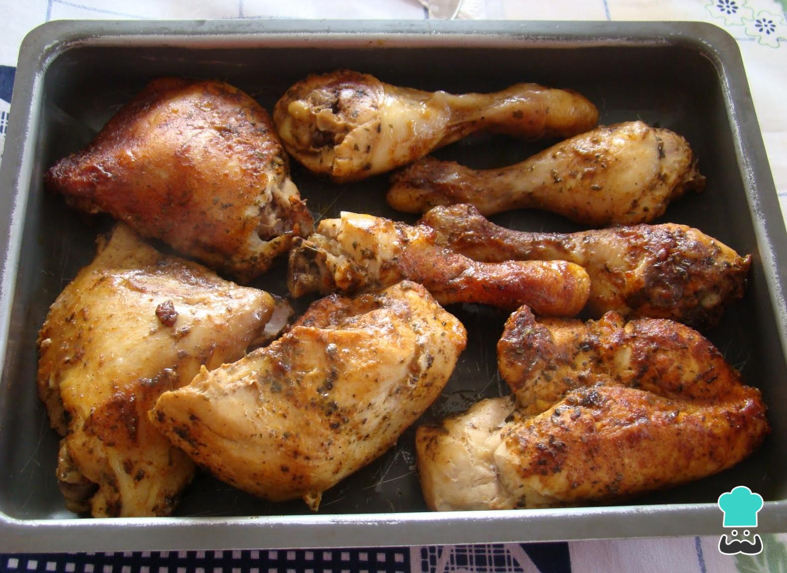 Tempere o frango com os alhos amassados, as folhas de louro, pimenta e sal. Coloque em um tabuleiro e leve a dourar no forno preaquecido a 200ºC durante 10-15 minutos.