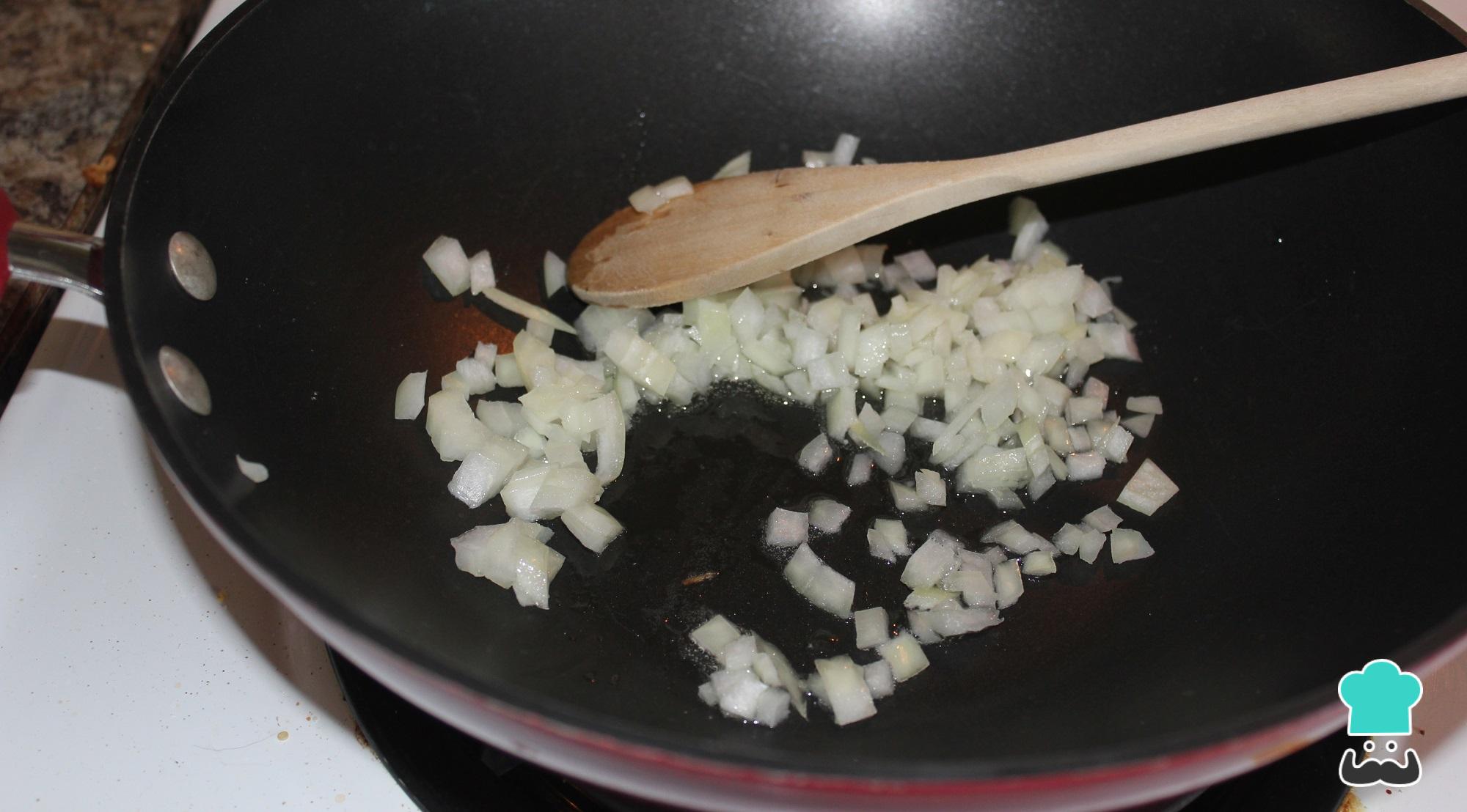 Enquanto o frango doura, continue preparando esta receita de frango com quiabo e batata levando ao fogo uma panela com um pouco de óleo e a cebola picada. Quando a cebola estiver dourada, adicione o frango e o quiabo, e frite durante 1-2 minutos.