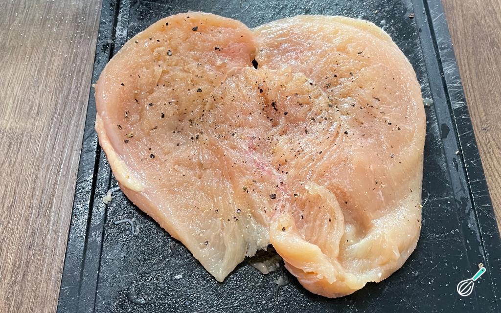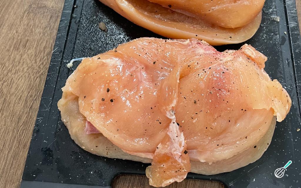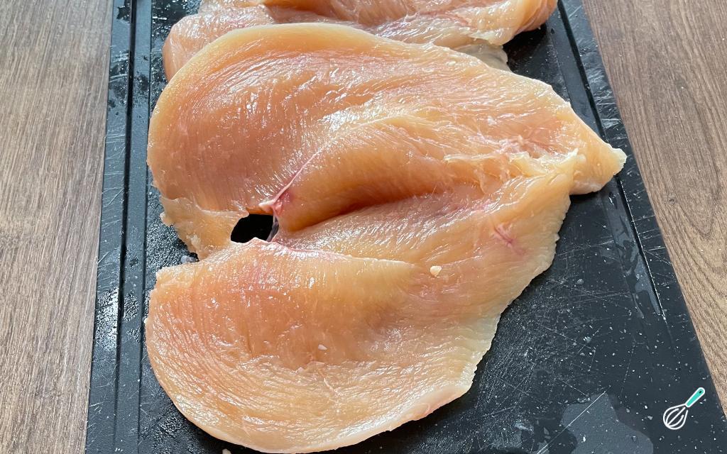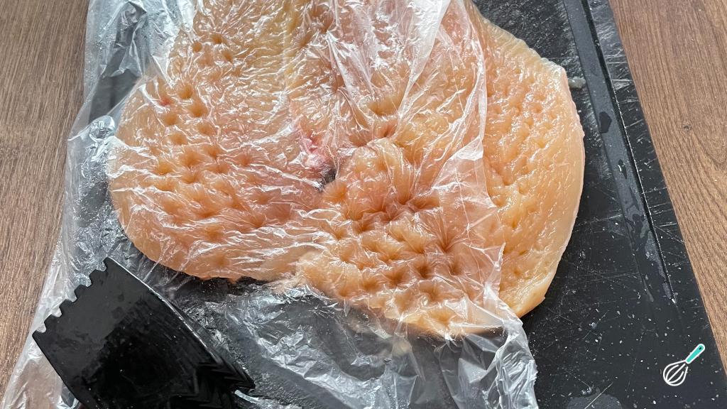 Com o auxílio de um martelo de carne, afine as partes mais grossas do peito de frango.