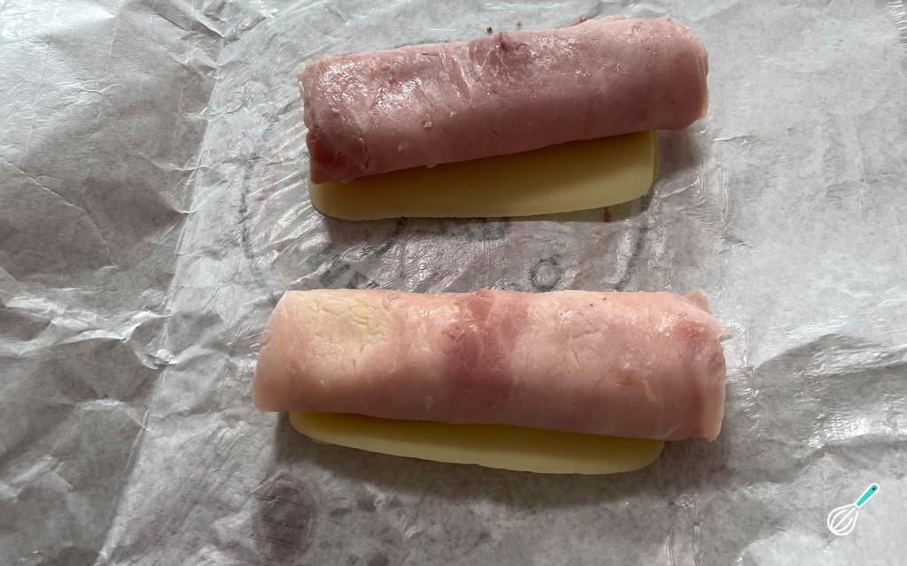 Faça 2 rolinhos com o presunto e queijo.
