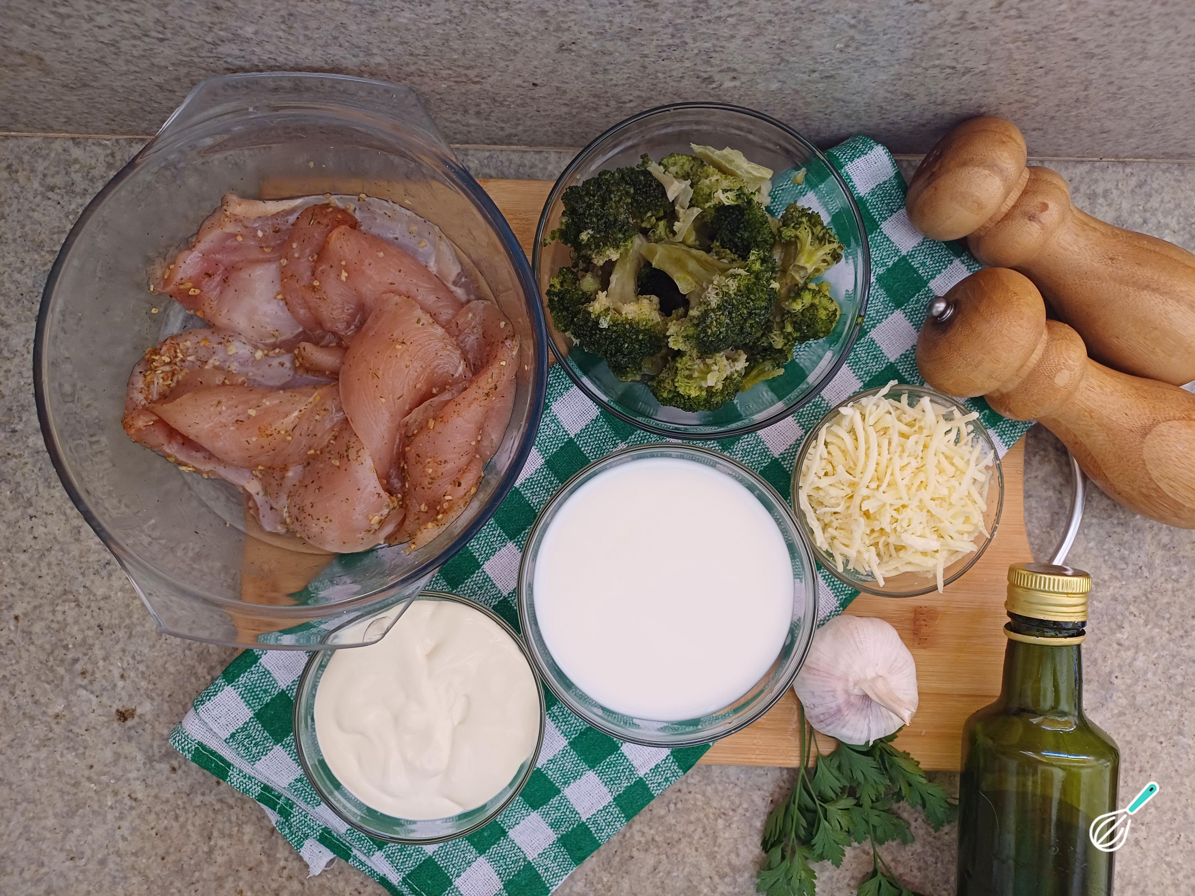 Reúna todos os ingredientes necessários para o preparo do frango cremoso com brócolis.