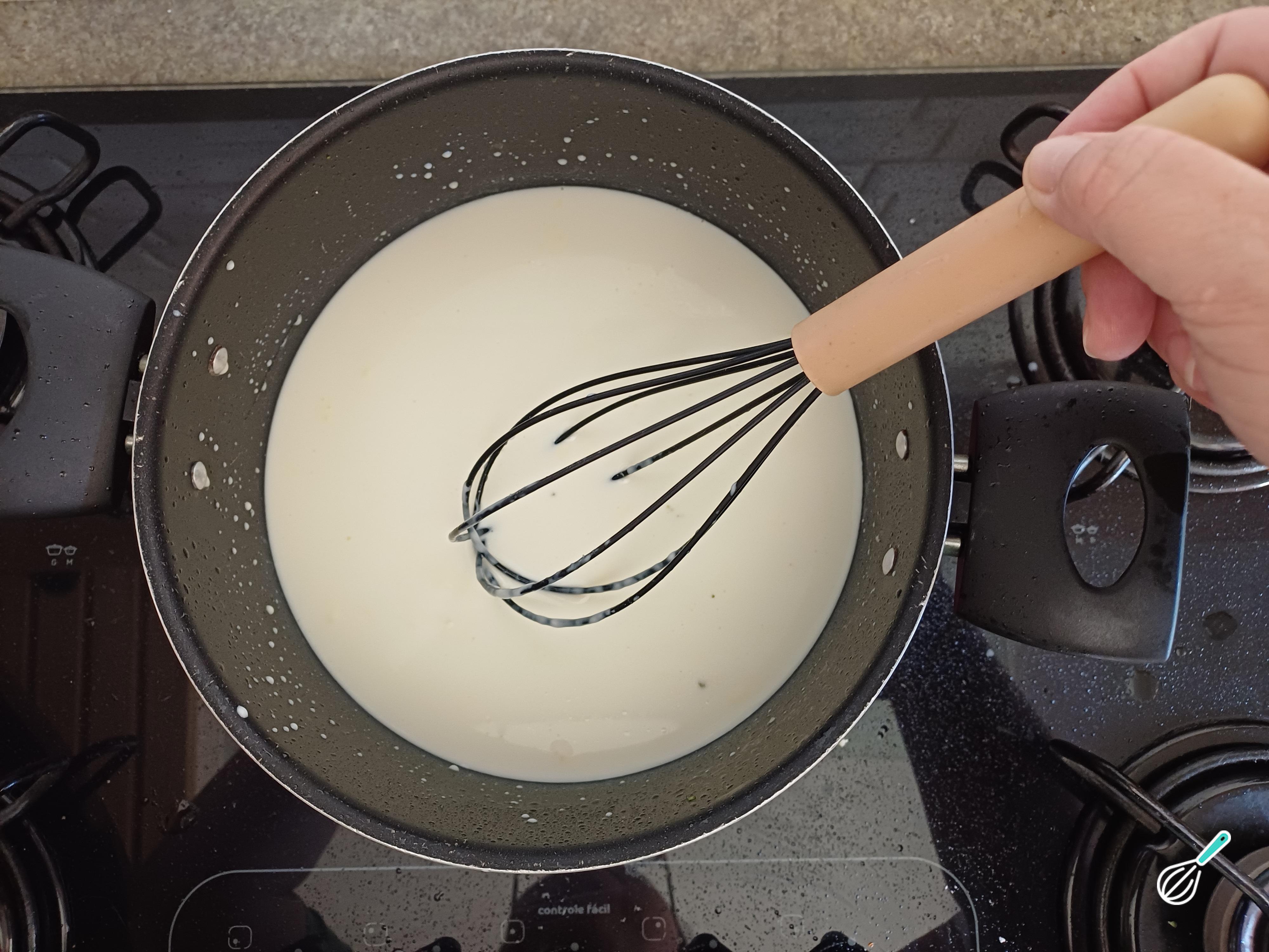 Em uma panela, adicione o requeijão cremoso e misture o creme de leite com um fouet e aqueça por 10 minutos, até o molho encorpar.