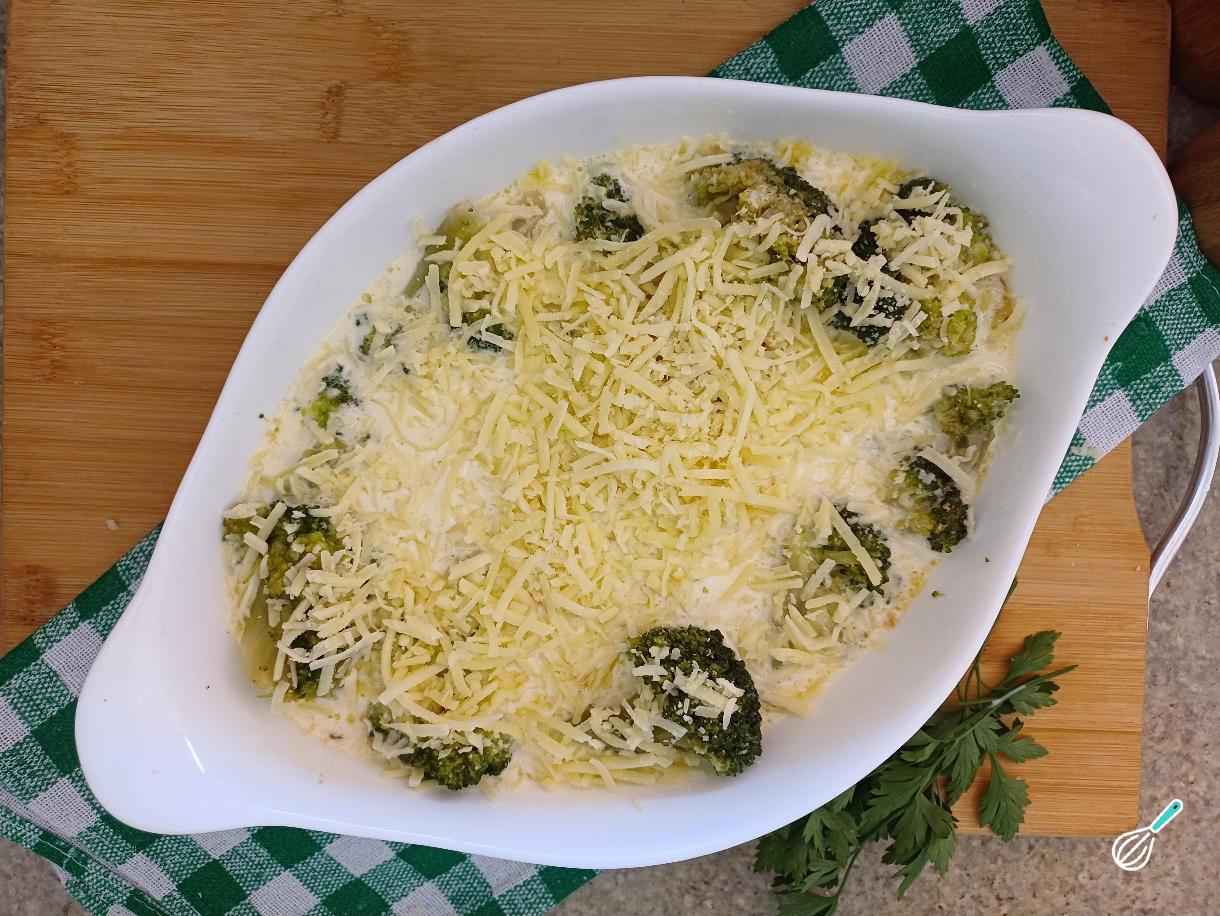 Coloque os brócolis refogados por cima para dar um toque de cor e polvilhe o queijo parmesão ralado.