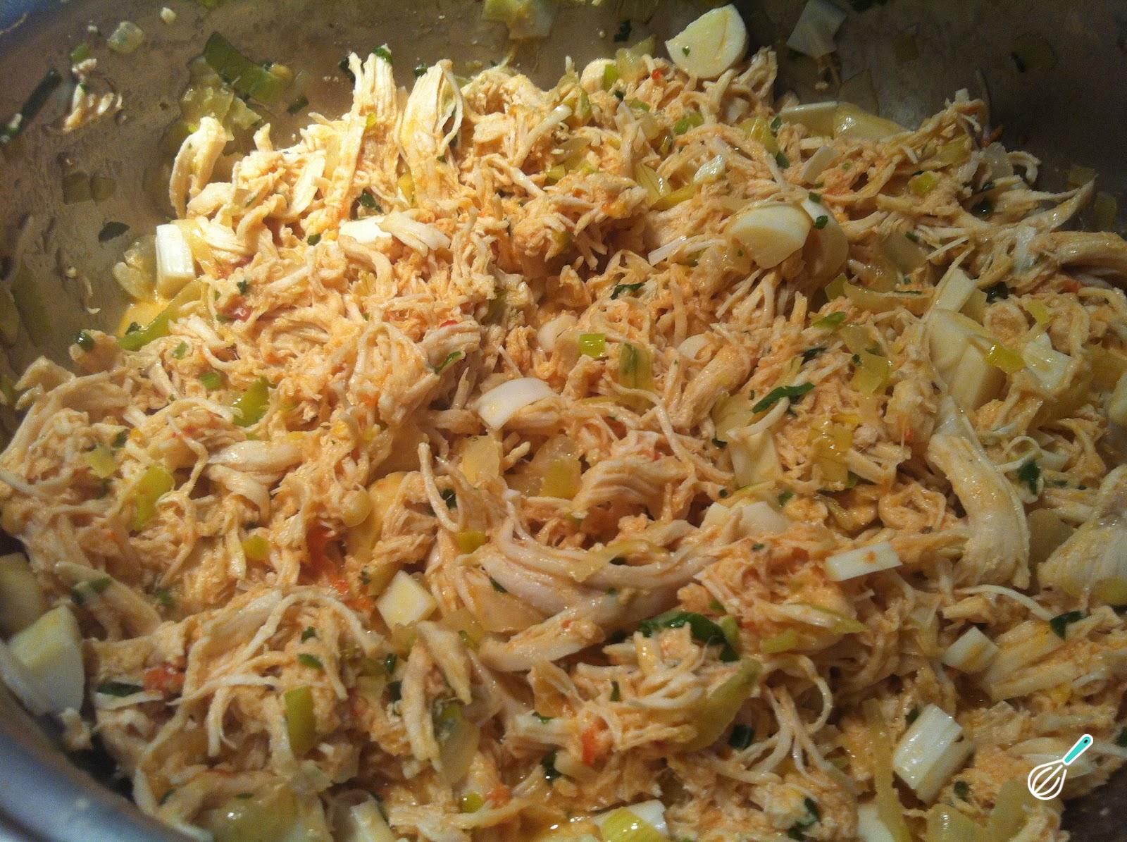 Esquente o óleo em uma panela e deixe dourar. Junte o frango, deixe refogar por alguns minutos e junte os temperos. Junte os ovos cozidos picados e o pão de forma umedecido. Acrescente a maionese e as azeitonas e misture tudo.