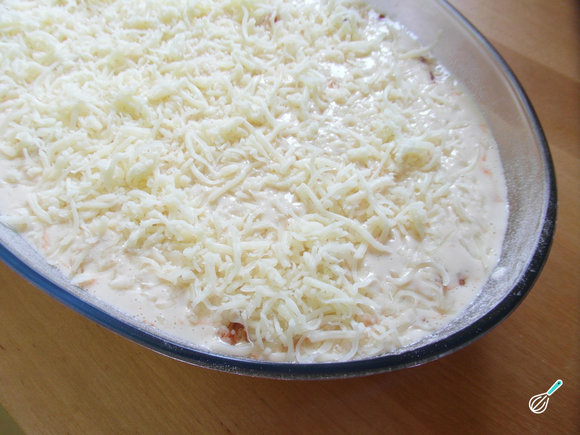 Transfira a mistura para um refratário e cubra com o queijo parmesão ou mussarela. Leve ao forno preaquecido a 170 º C até gratinar.