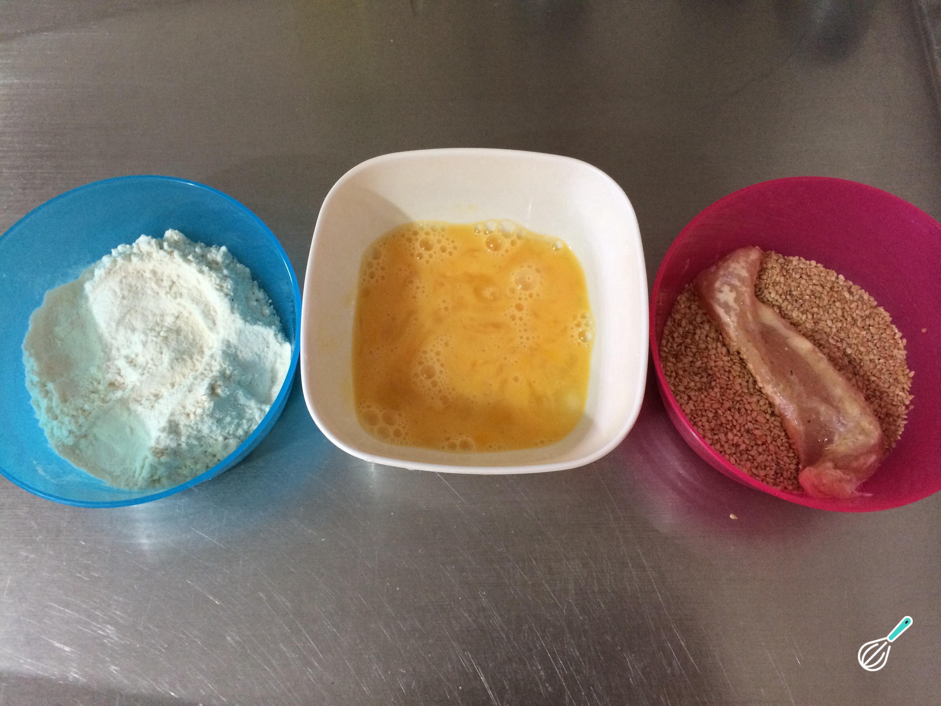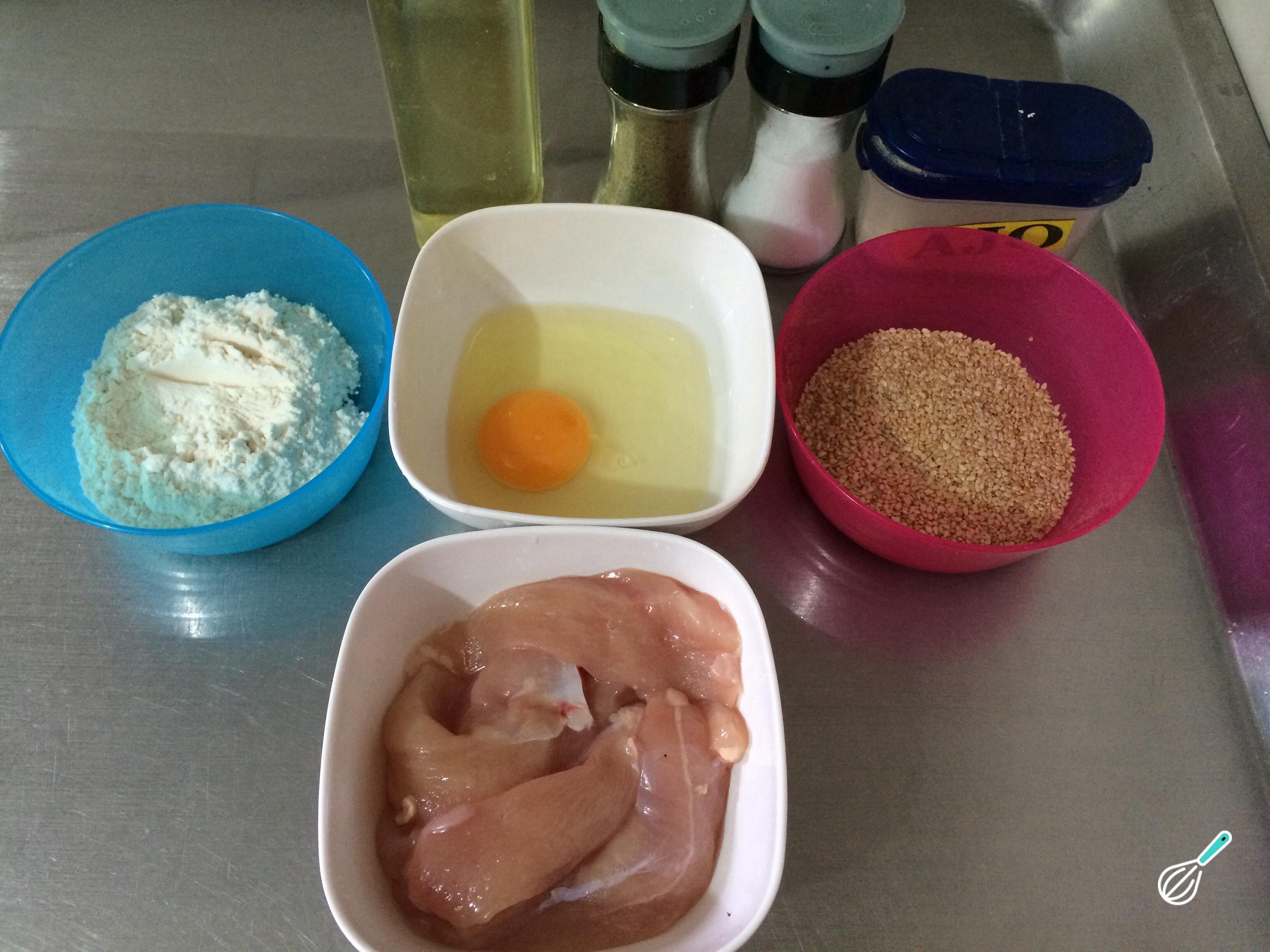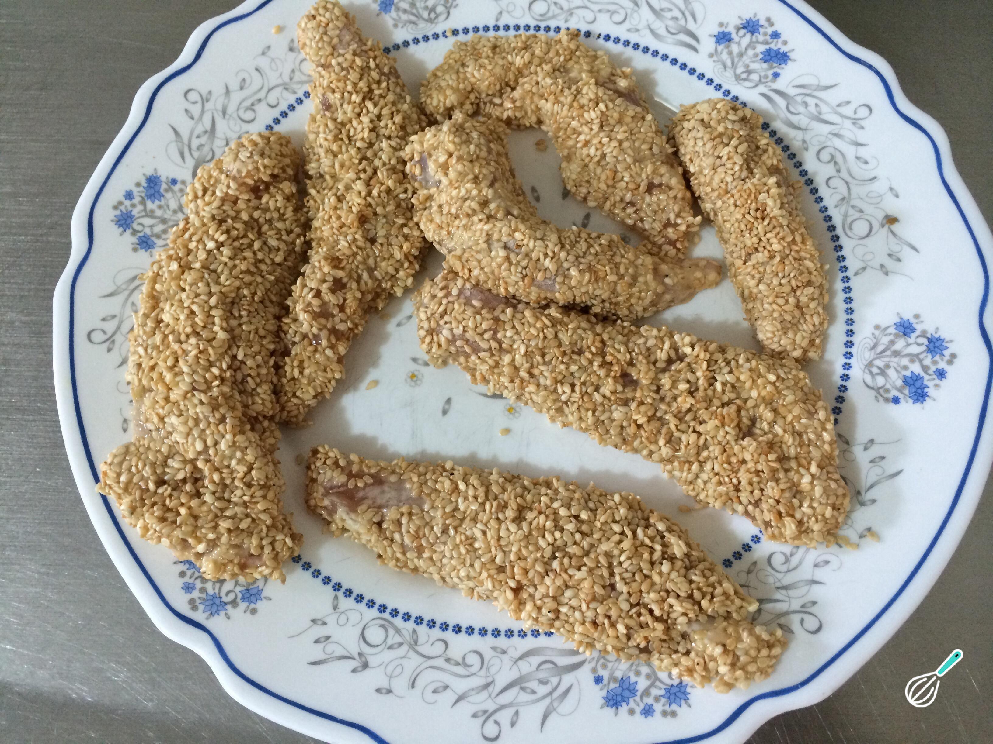 Corte o peito de frango em tiras grossas e tempere com sal e pimenta. Mergulhe na farinha de trigo, depois no ovo batido e finalmente nas sementes de gergelim.Envolva muito bem a carne com cada um destes ingredientes.