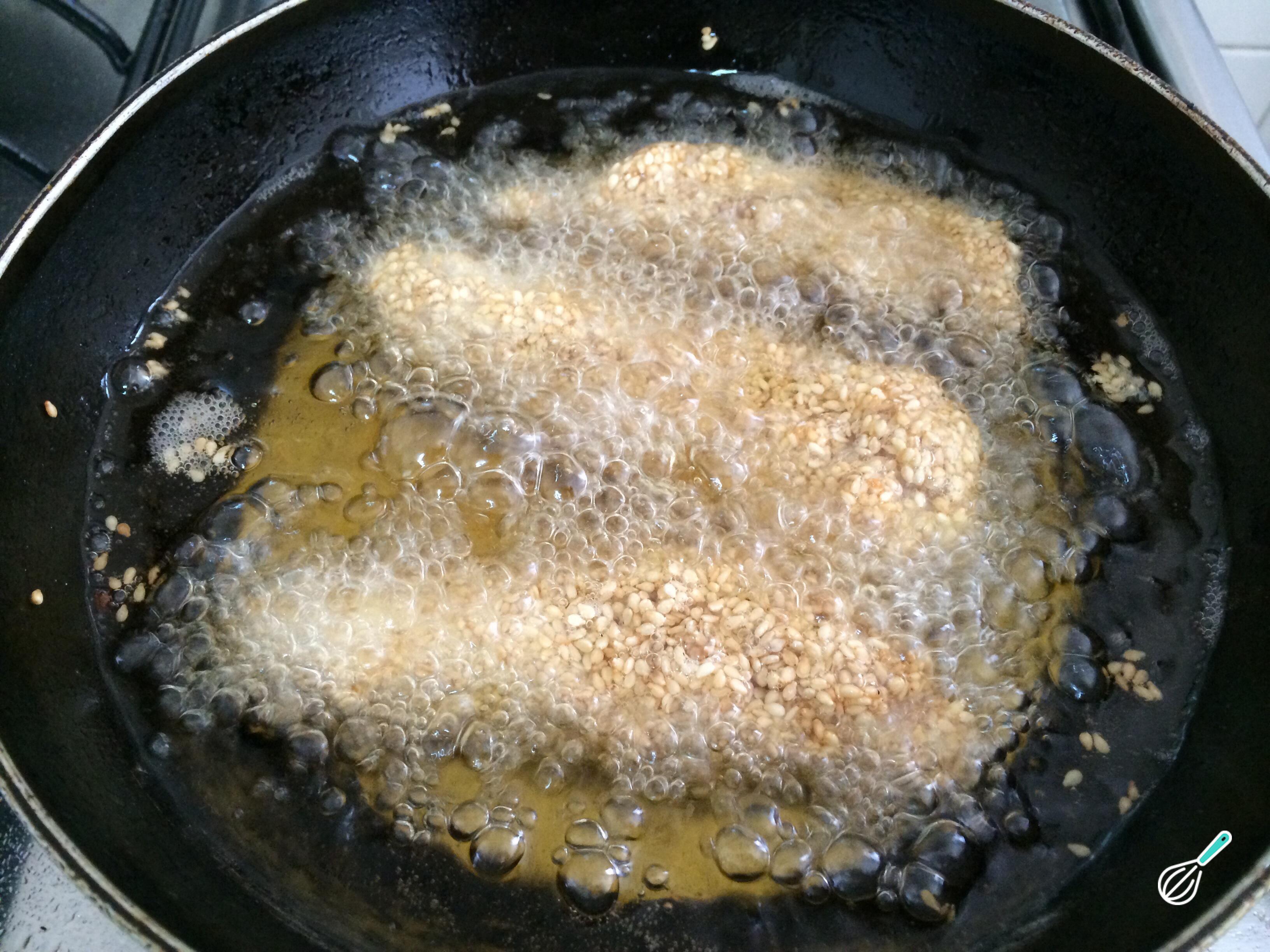 Após o passo anterior, frite a carne em óleo quente durante 8 minutos, ou até que o gergelim fique dourado. Retire e reserve em papel absorvente, de forma a escorrer o excesso de gordura.
