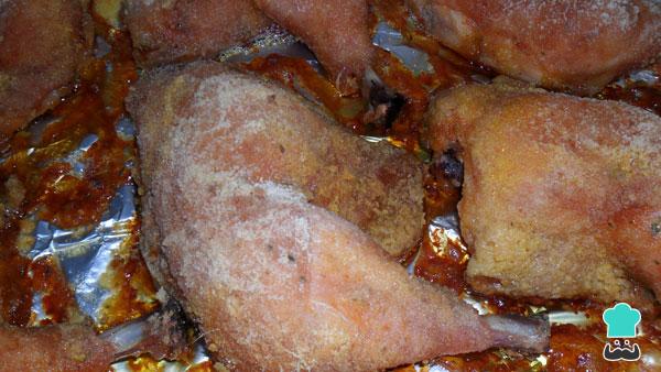 Coloque as sobrecoxas em uma assadeira e leve ao forno por aproximadamente 1 hora. Até que fiquem douradas e crocantes.