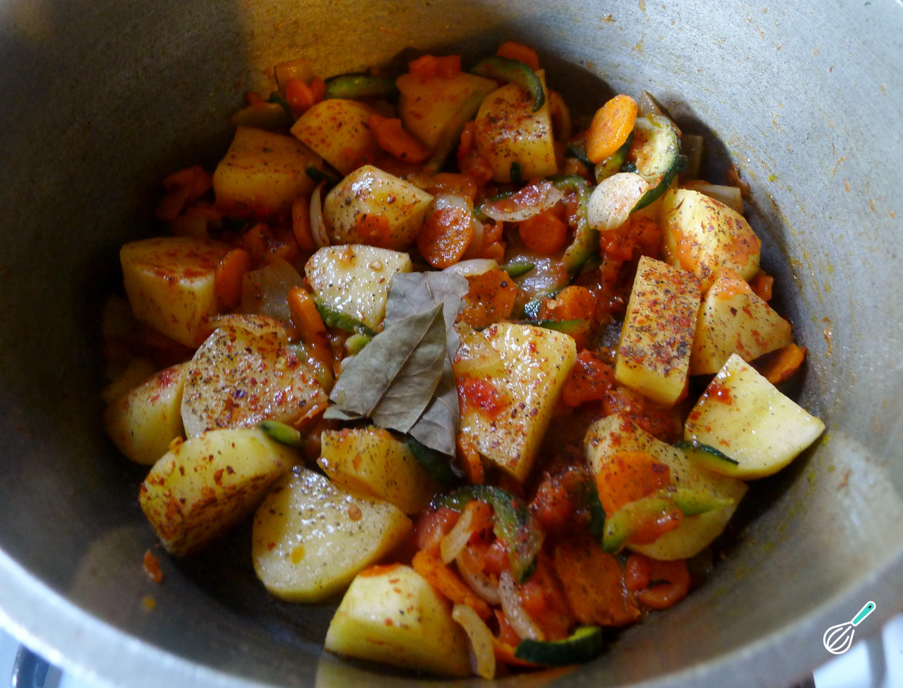 Quando a cebola e a abobrinha na panela estiverem macias, acrescente as batatas, o tomate, o louro e os temperos a gosto. Misture tudo.