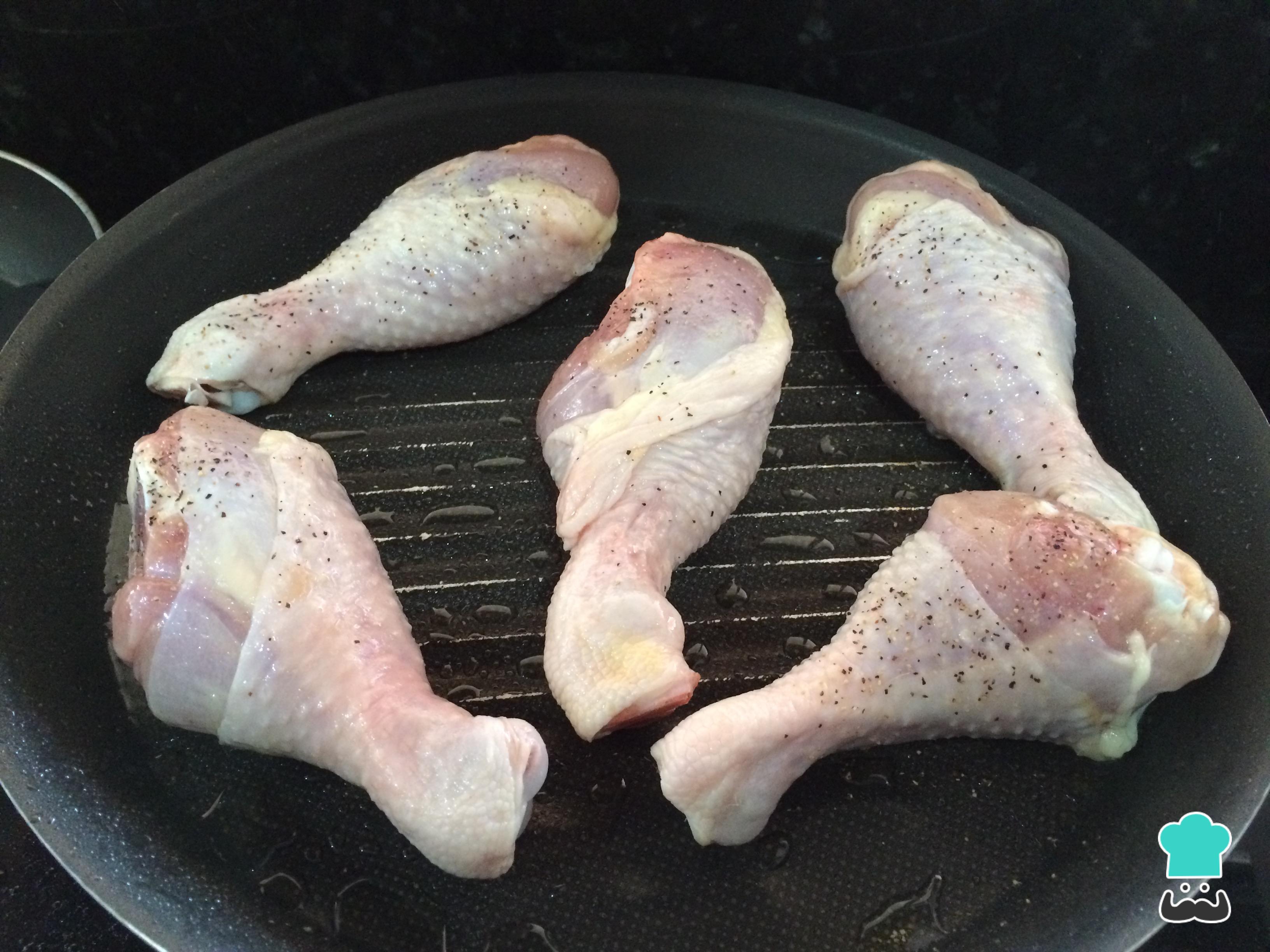 Tempere as pernas de frango com sal e pimenta a gosto e doure numa frigideira com um pouco de azeite. Retire para um prato quando estiverem douradas de todos os lados, ainda que no interior estejam cruas (iremos terminar de cozinhar no último passo).
