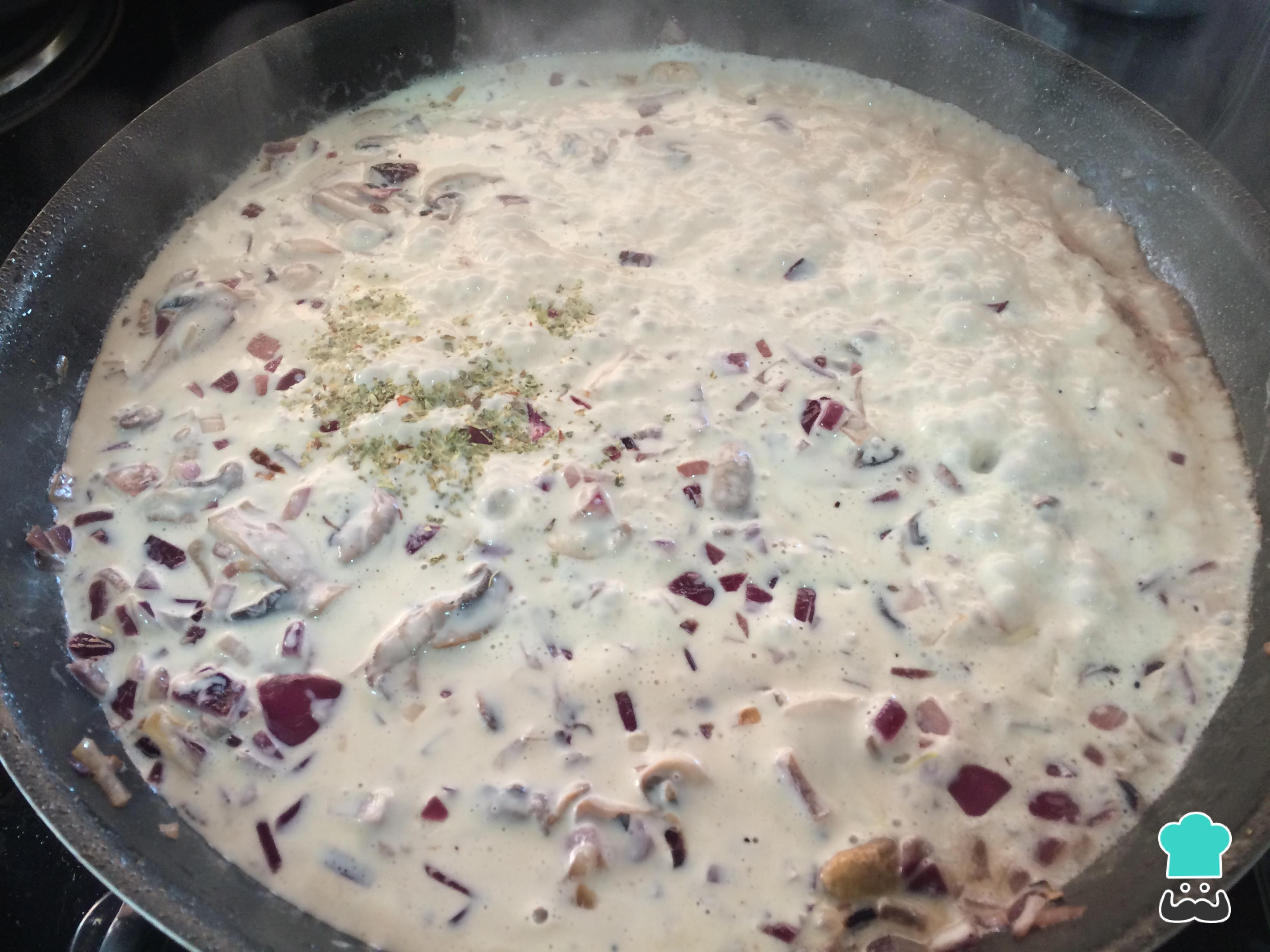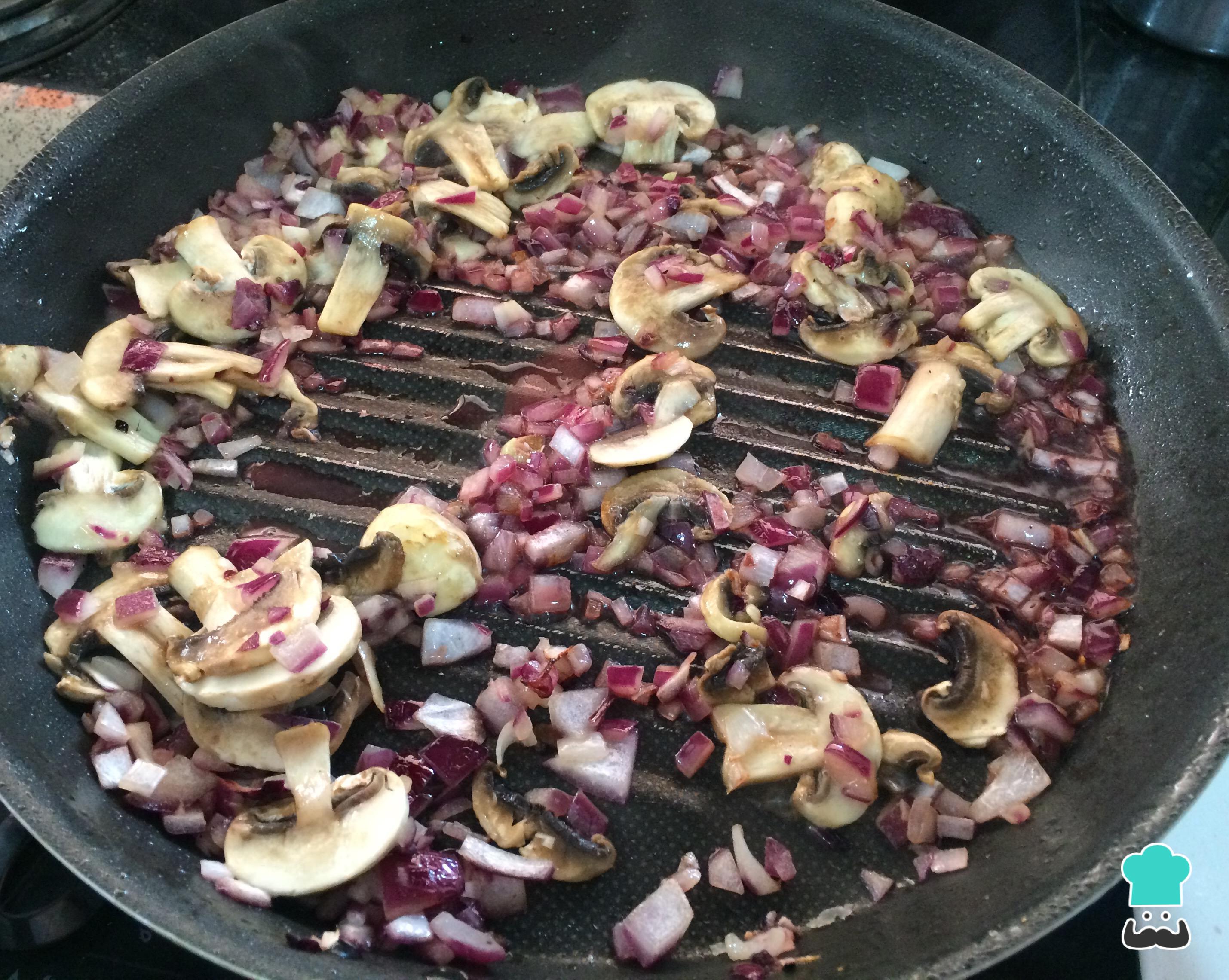 Em seguida acrescente os cogumelos cortados em fatias e refogue por alguns minutos. Adicione o vinho e deixe o álcool evaporar.