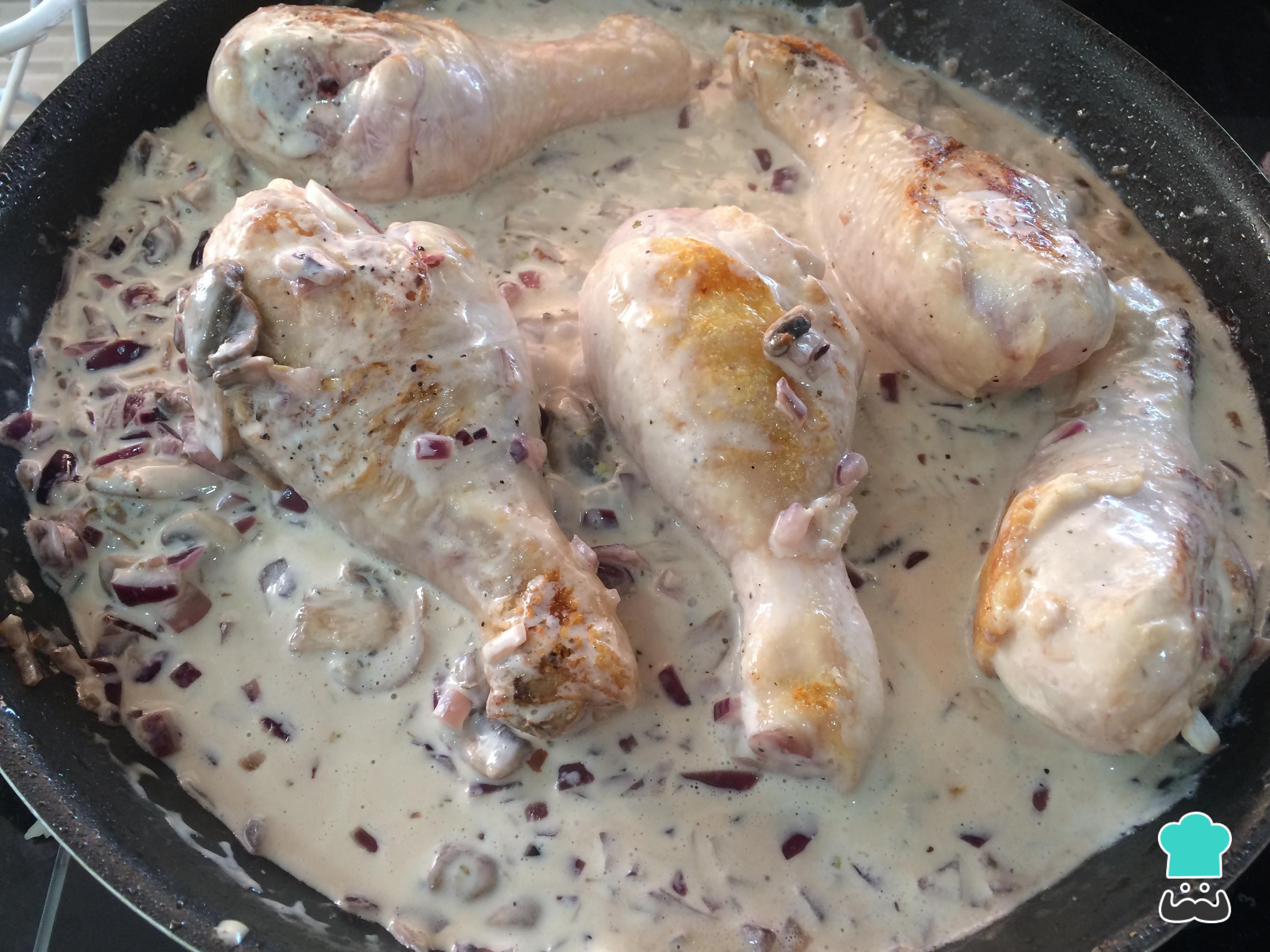 Por fim adicione as coxas de frango, tampe e deixe cozinhar por 40 minutos. No final o molho deverá estar mais espesso e a carne deverá estar cozinhada no interior.