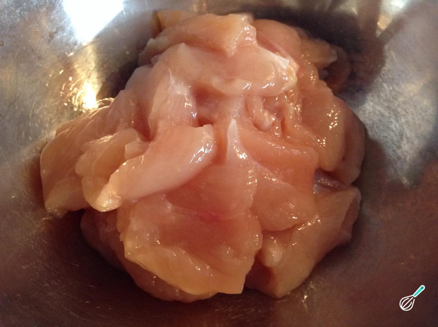 Corte o peito de frango desossado em cubos médios e coloque-o em uma tigela.