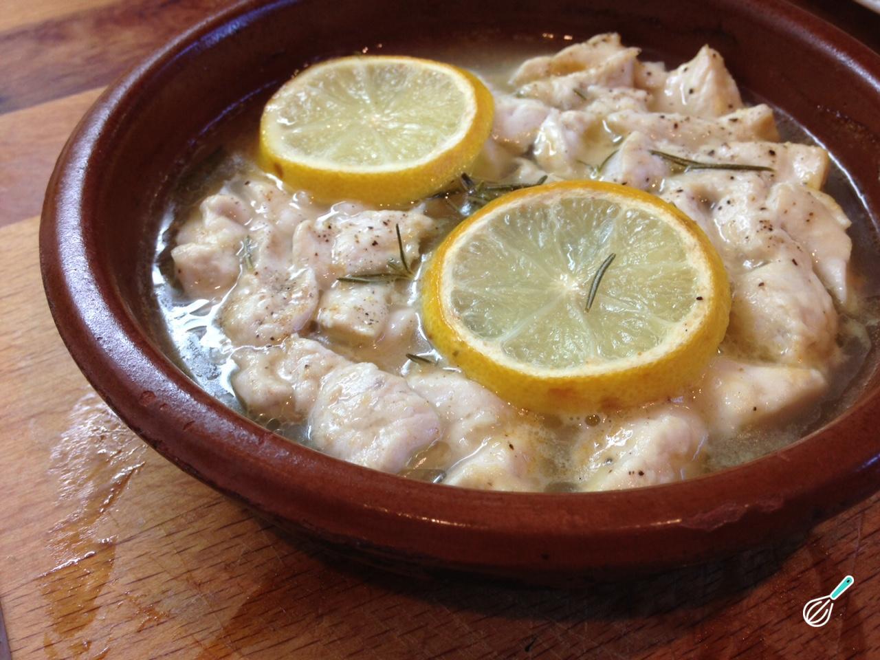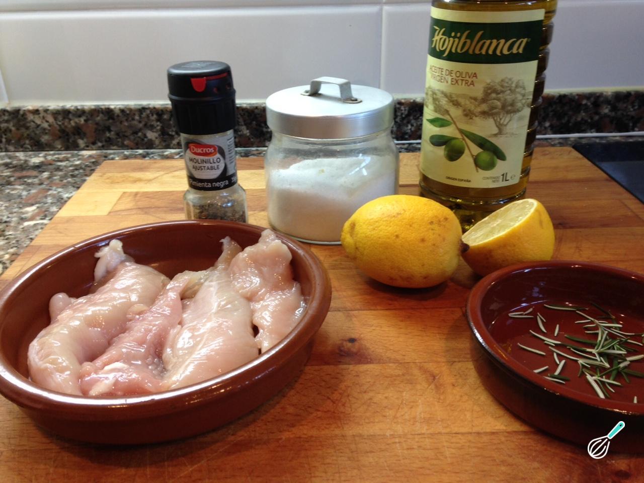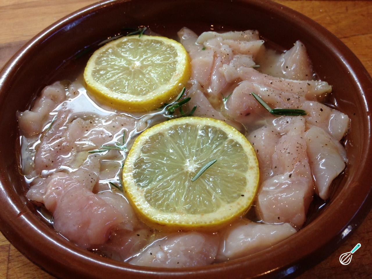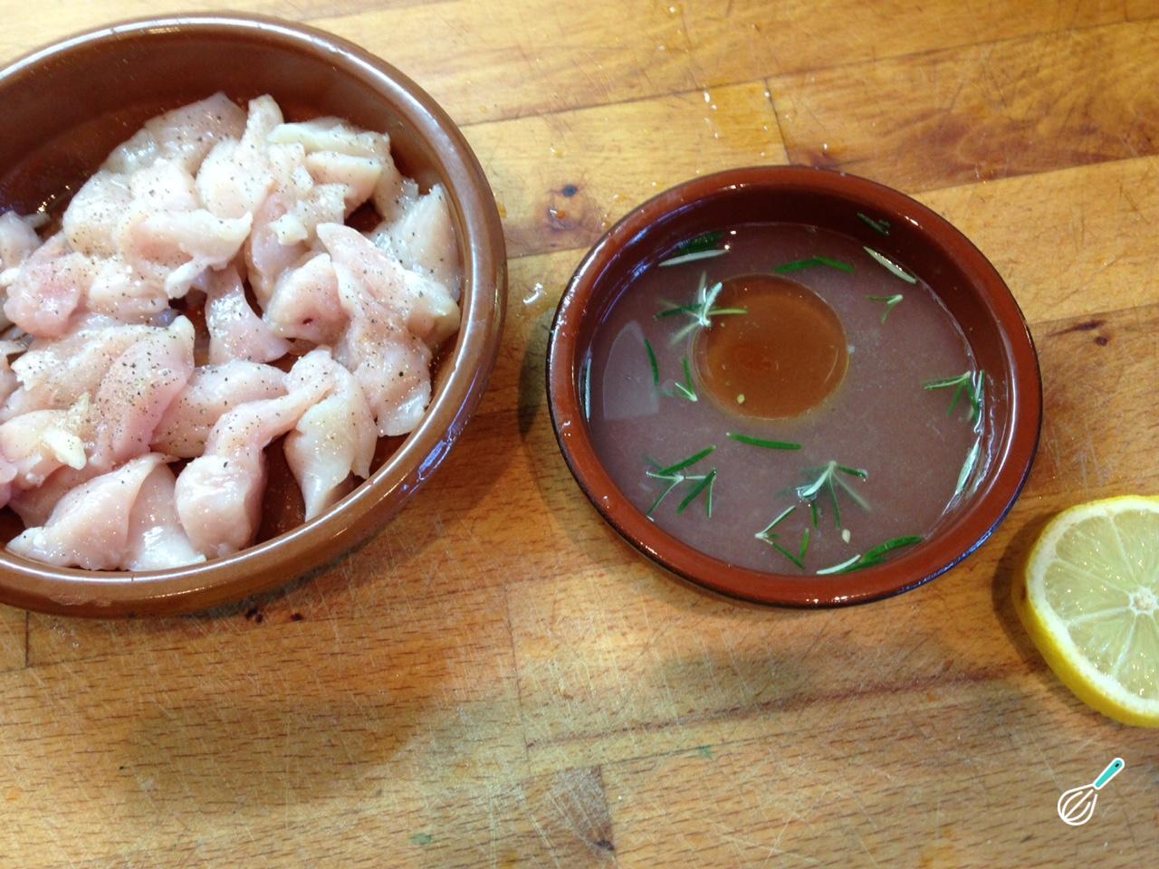 Corte os peitos de frango em pedaços e tempere com sal e pimenta. Em uma tigela misture uma colher de sopa de azeite virgem extra, o suco de um limão inteiro e o alecrim.