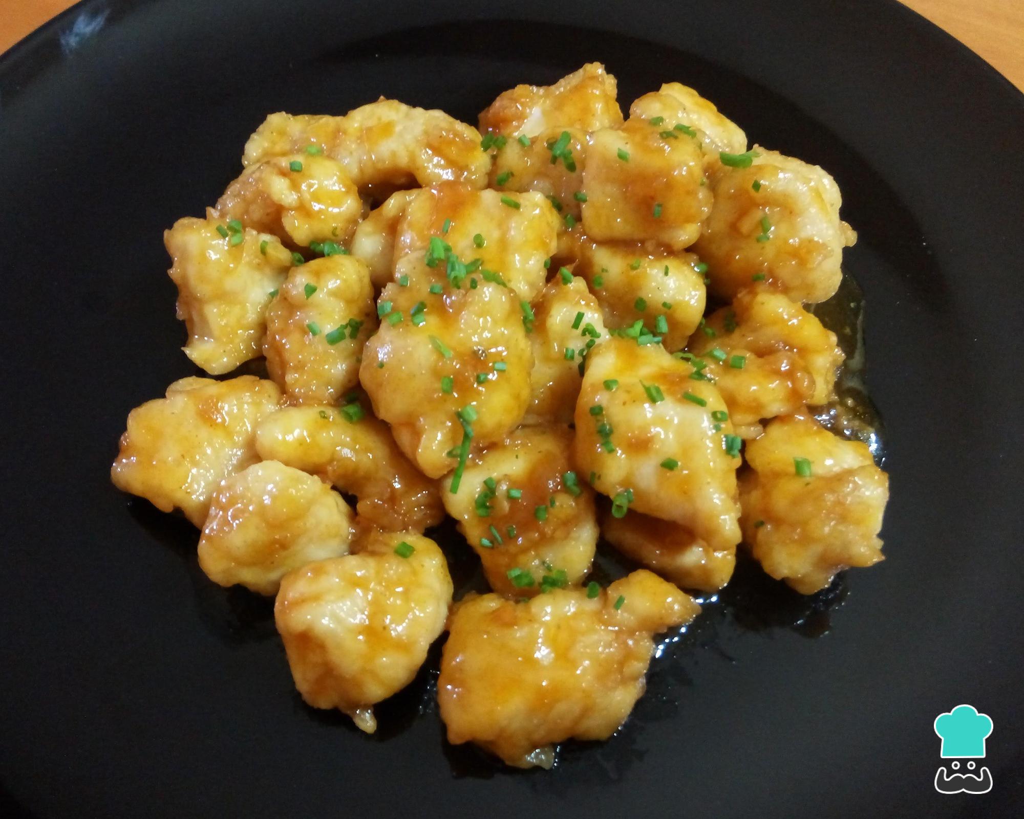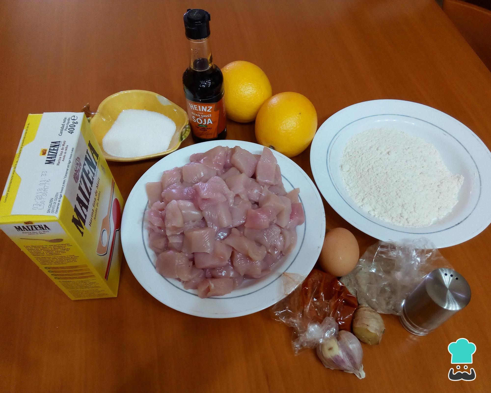 Prepare os ingredientes desta receita de frango ao molho agridoce: corte os peitos de frango em cubinhos, misture a maisena com a farinha e separe os demais ingredientes.