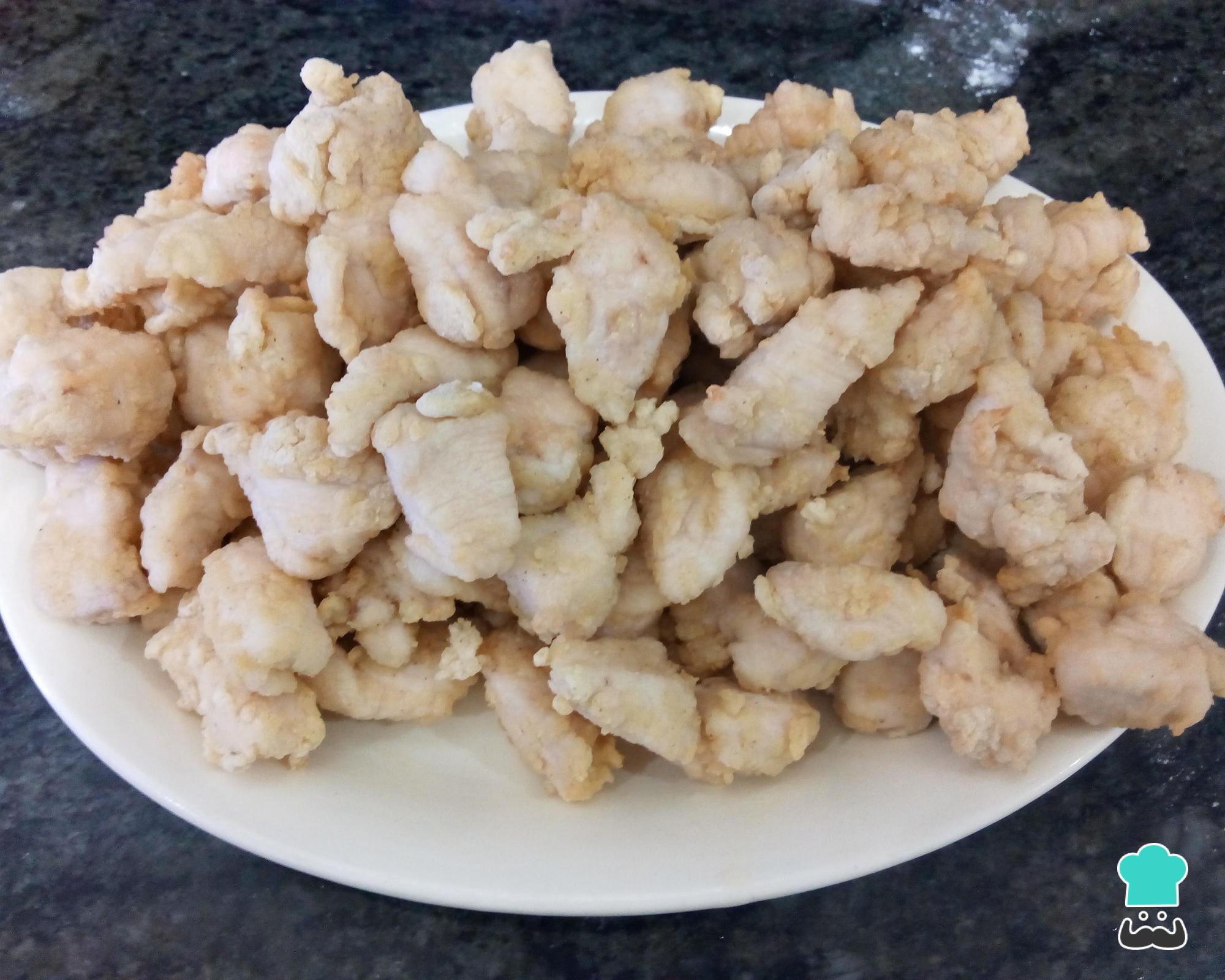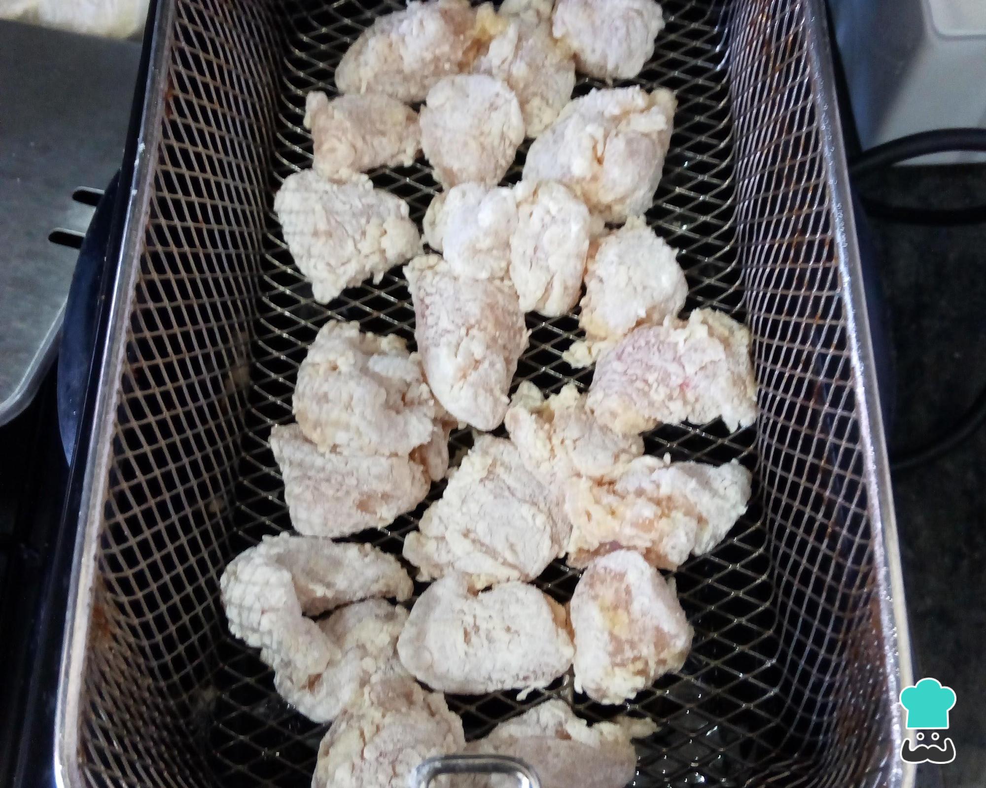 Após o tempo indicado retire os pedacinhos de frango da mistura em que ficaram marinando e envolva na maisena e farinha de trigo. Coloque o óleo para esquentar e, quando estiver bem quente, frite alguns pedaços de frango de cada vez até começar a dourar.