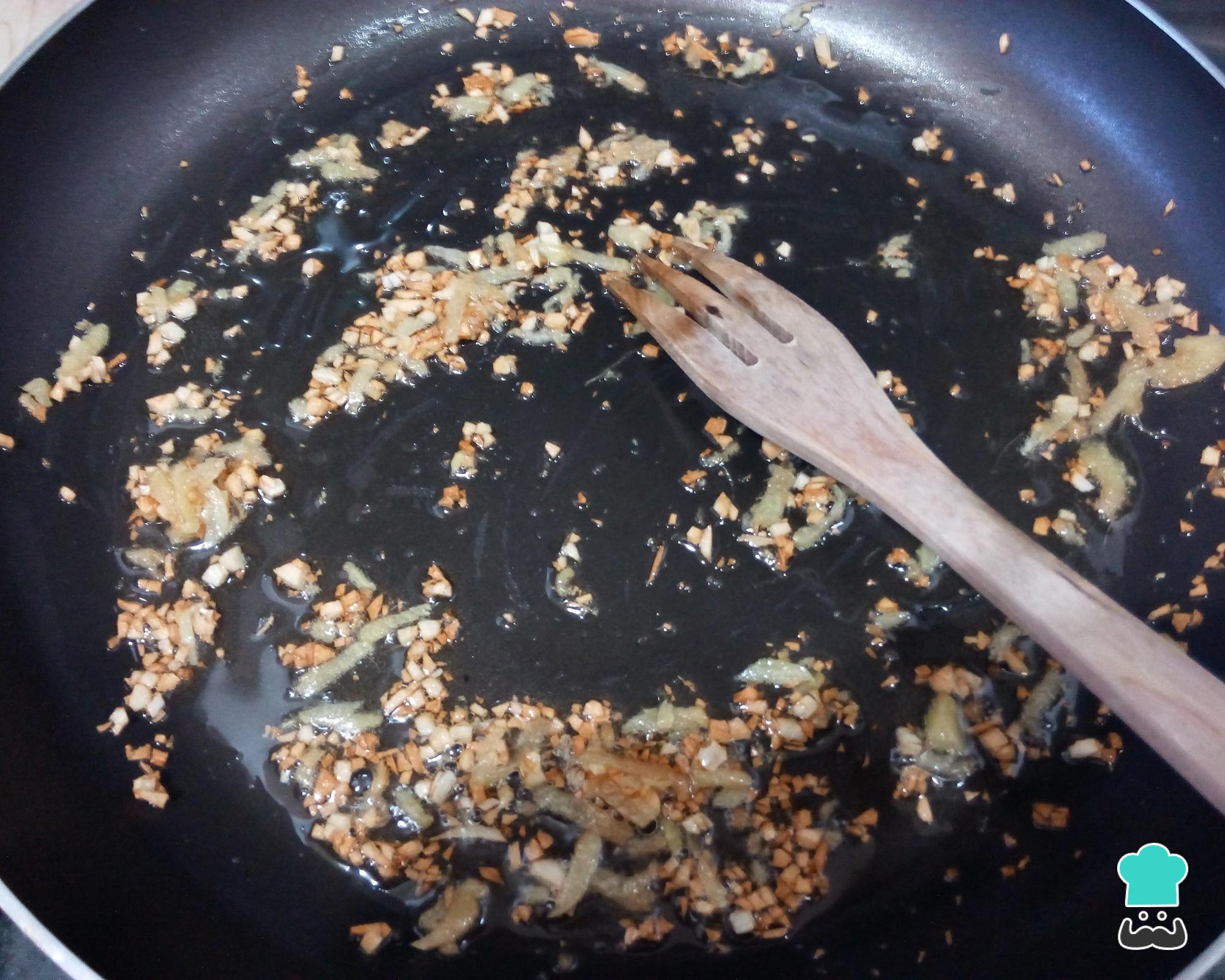 Enquanto isso prepare o molho agridoce de laranja: leve ao fogo uma frigideira com o azeite, o gengibre e os alhos. Refogue por 1-2 minutos, mexendo de vez em quando, até estes ingredientes libertarem seus aromas e dourarem um pouco.