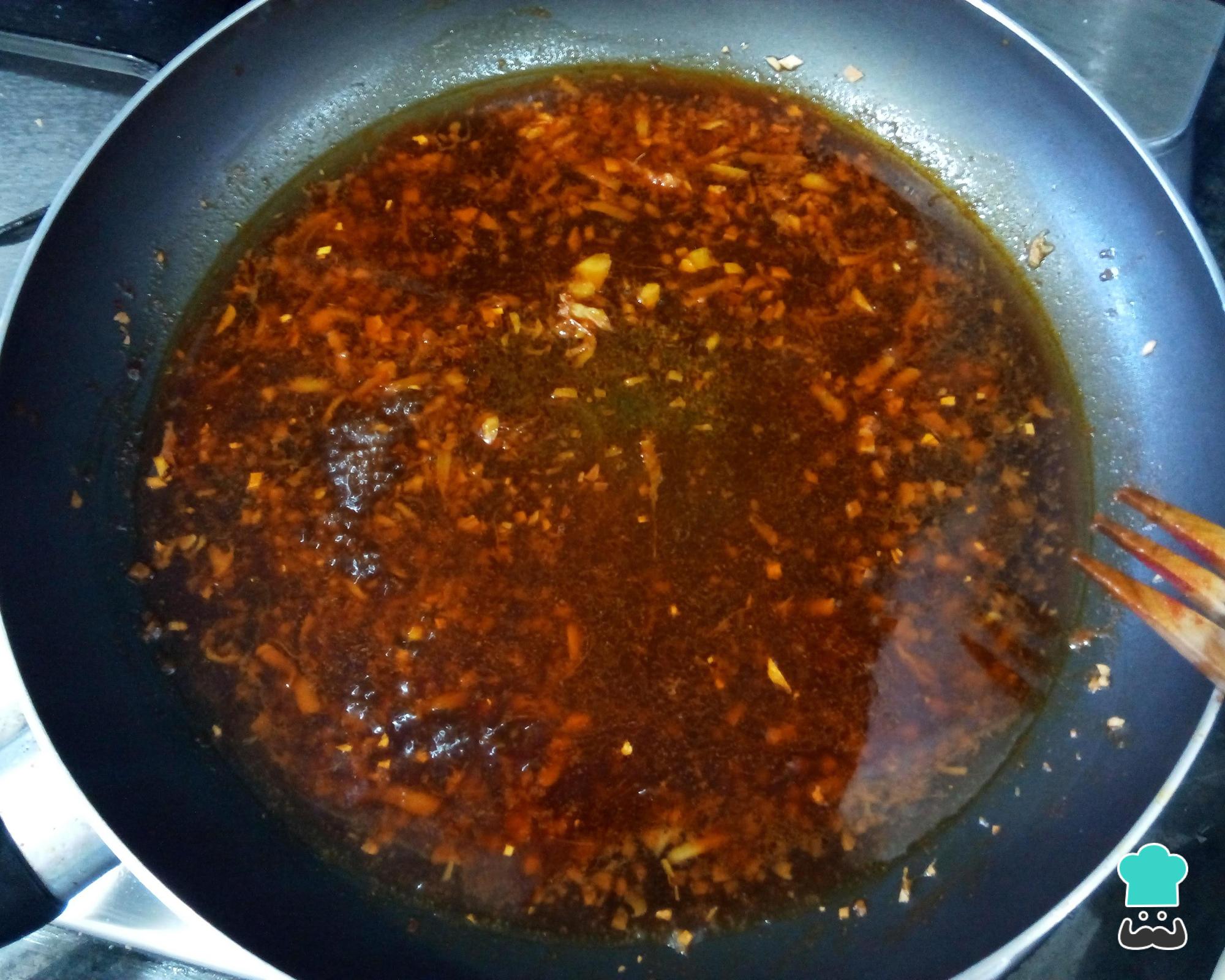 Coloque a pimenta caiena e o vinagre ou e deixe ferver um pouco, para intensificar os sabores. Depois junte também o shoyu e a água e deixe cozinhar no fogo médio, mexendo de vez em quando, por uns 5 minutos.
