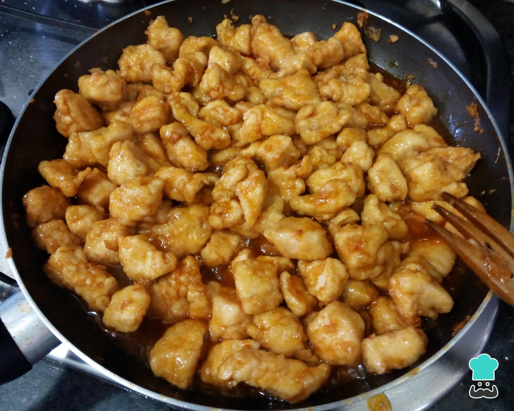 À medida que frita os pedaços de frango, retire-os para um prato com papel absorvente e deixe escorrer o excesso de óleo. Continue fritando o frango sem deixar dourar demasiado, para que não fique ressequido (o frango terminará de cozinhar junto com o molho).
