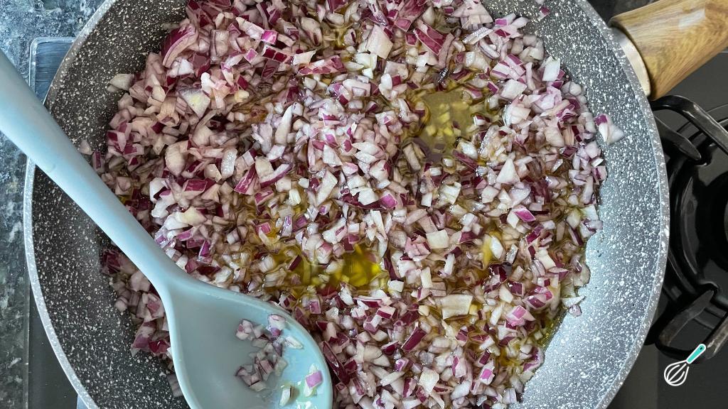 Numa panela grande, coloque a cebola picada e o azeite.