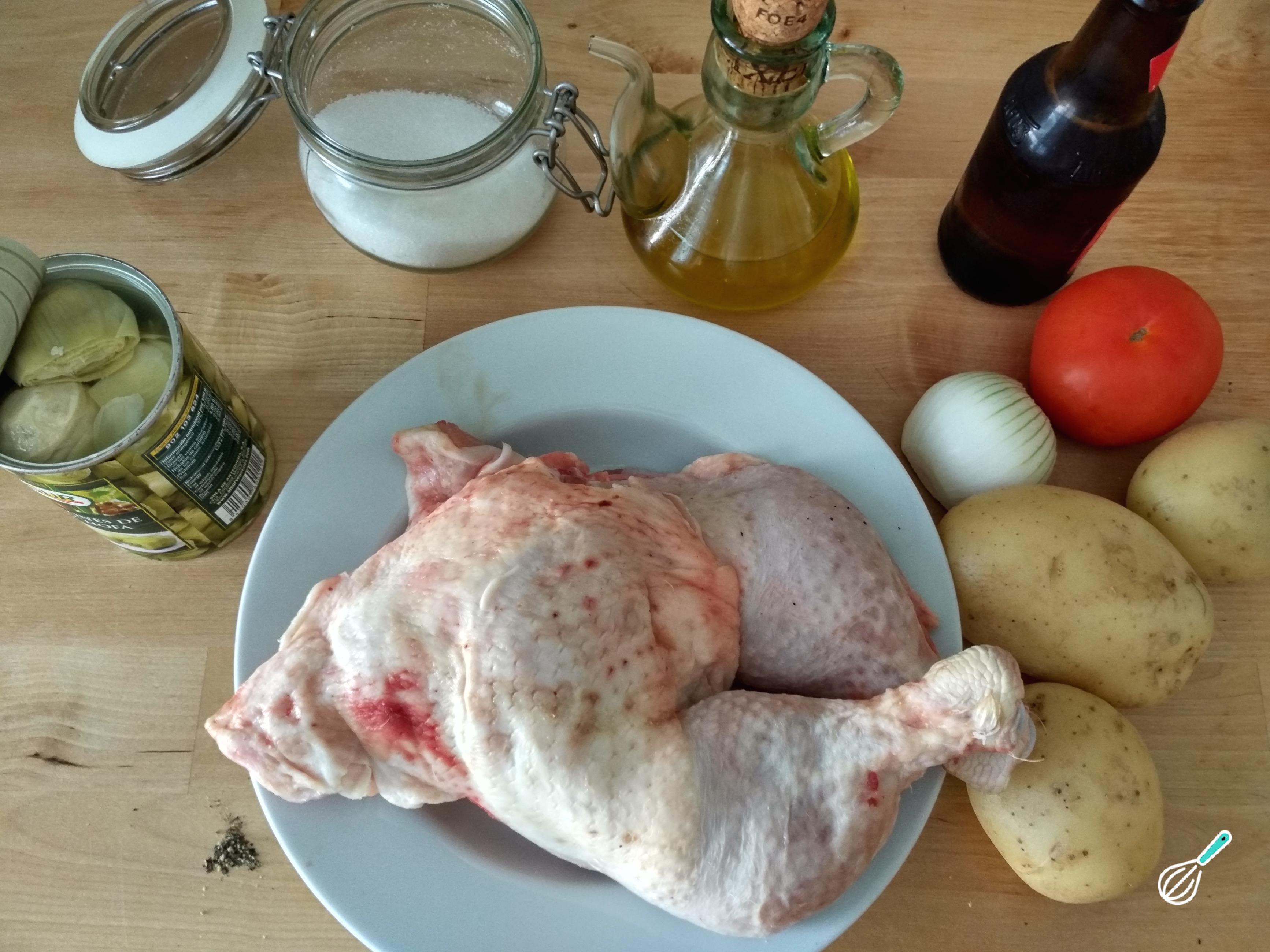 Comece por reunir todos os ingredientes para fazer o frango no forno light com batatas e alcachofras.