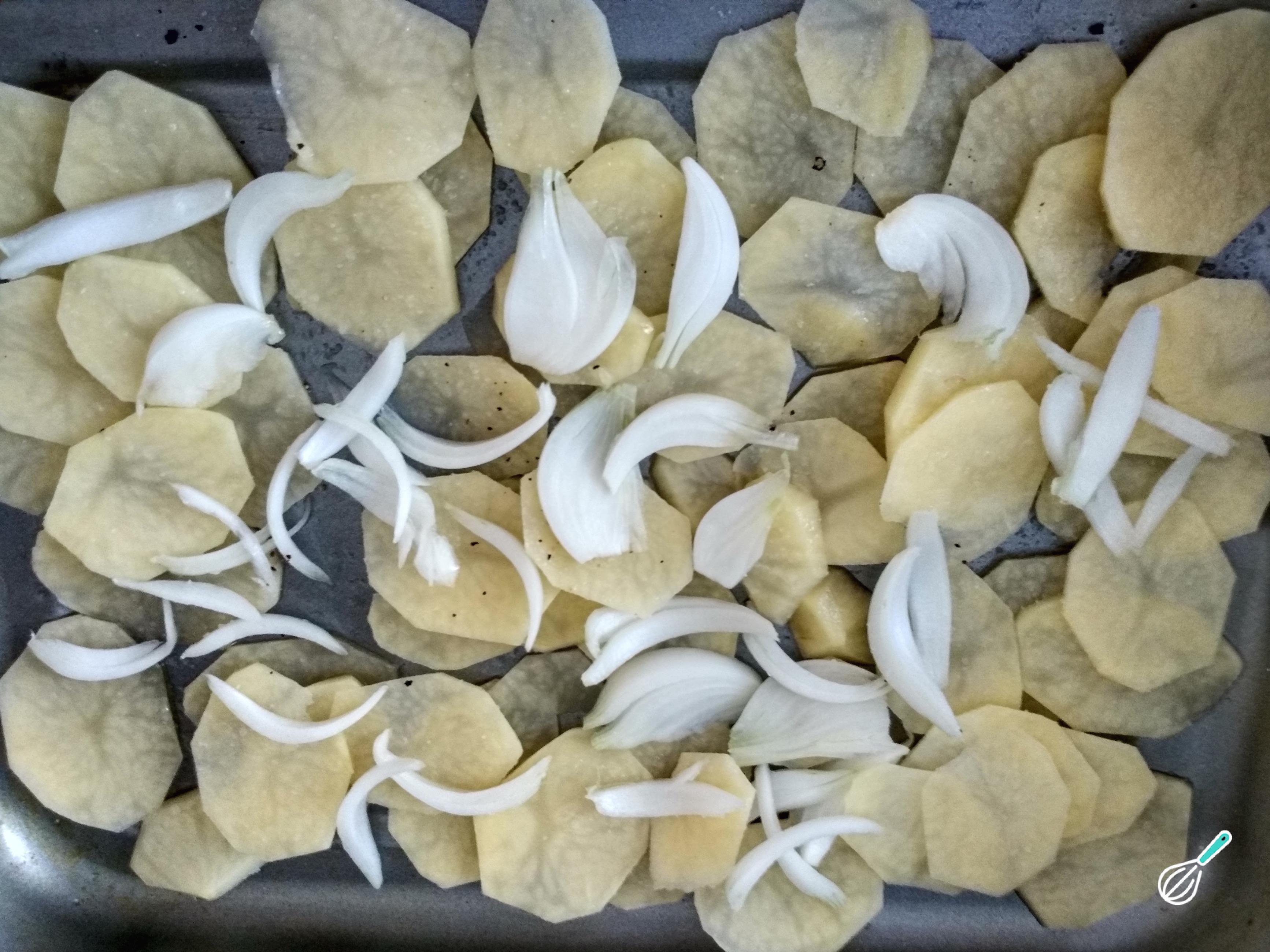 Descasque as batatas e corte-as em rodelas finas. Coloque-as em uma assadeira com um pouco de azeite e tempere com sal e pimenta-do-reino. Espalhe a cebola cortada em tiras em cima das batatas.