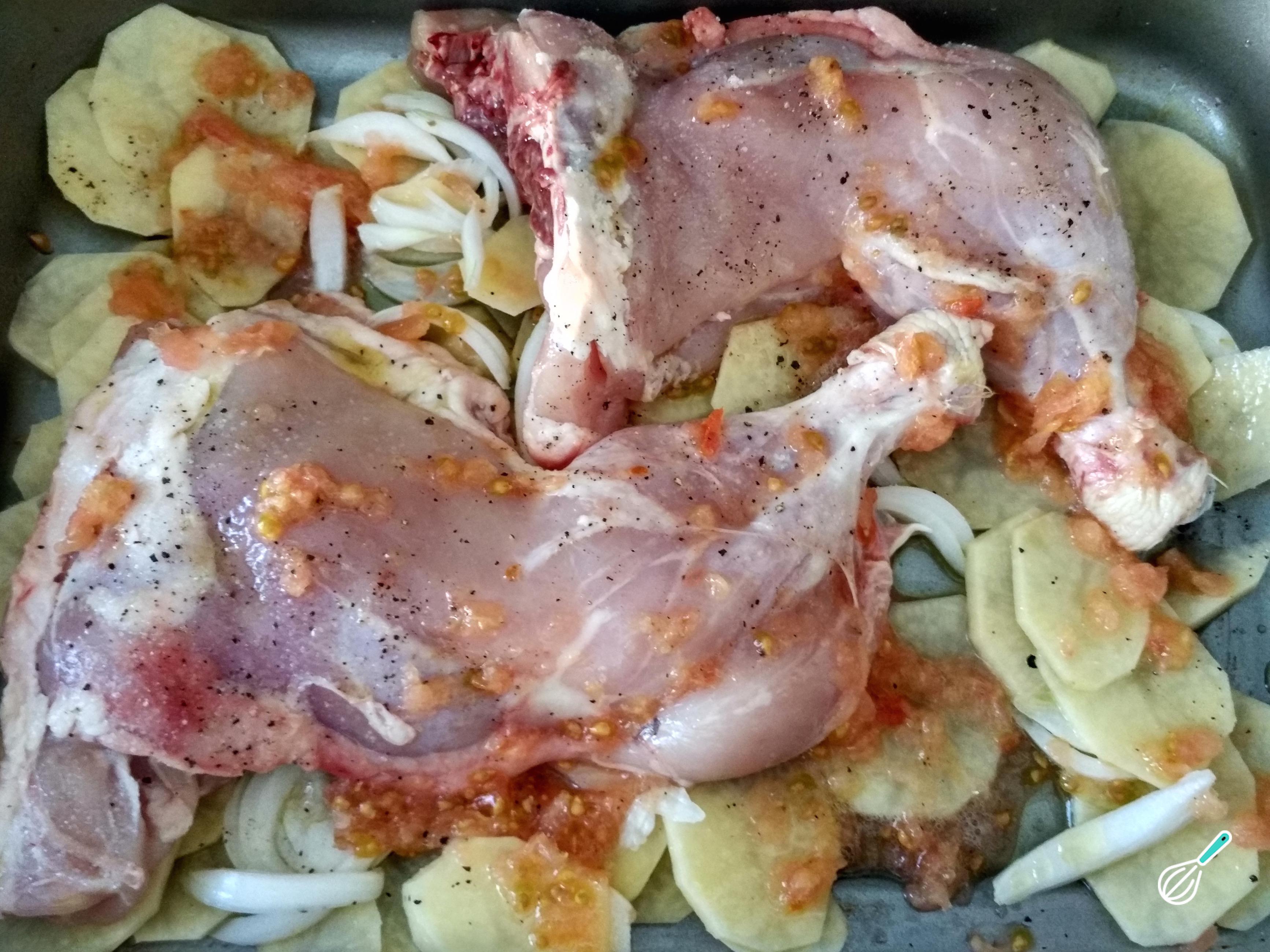 Retire a pele do frango, tempere e coloque-o sobre as batatas. Coloque um pouco mais de azeite sobre o frango. Rale o tomate e junte-o ao resto dos ingredientes, como na imagem. Coloque o frango no forno a 180 ° C por 20 minutos.