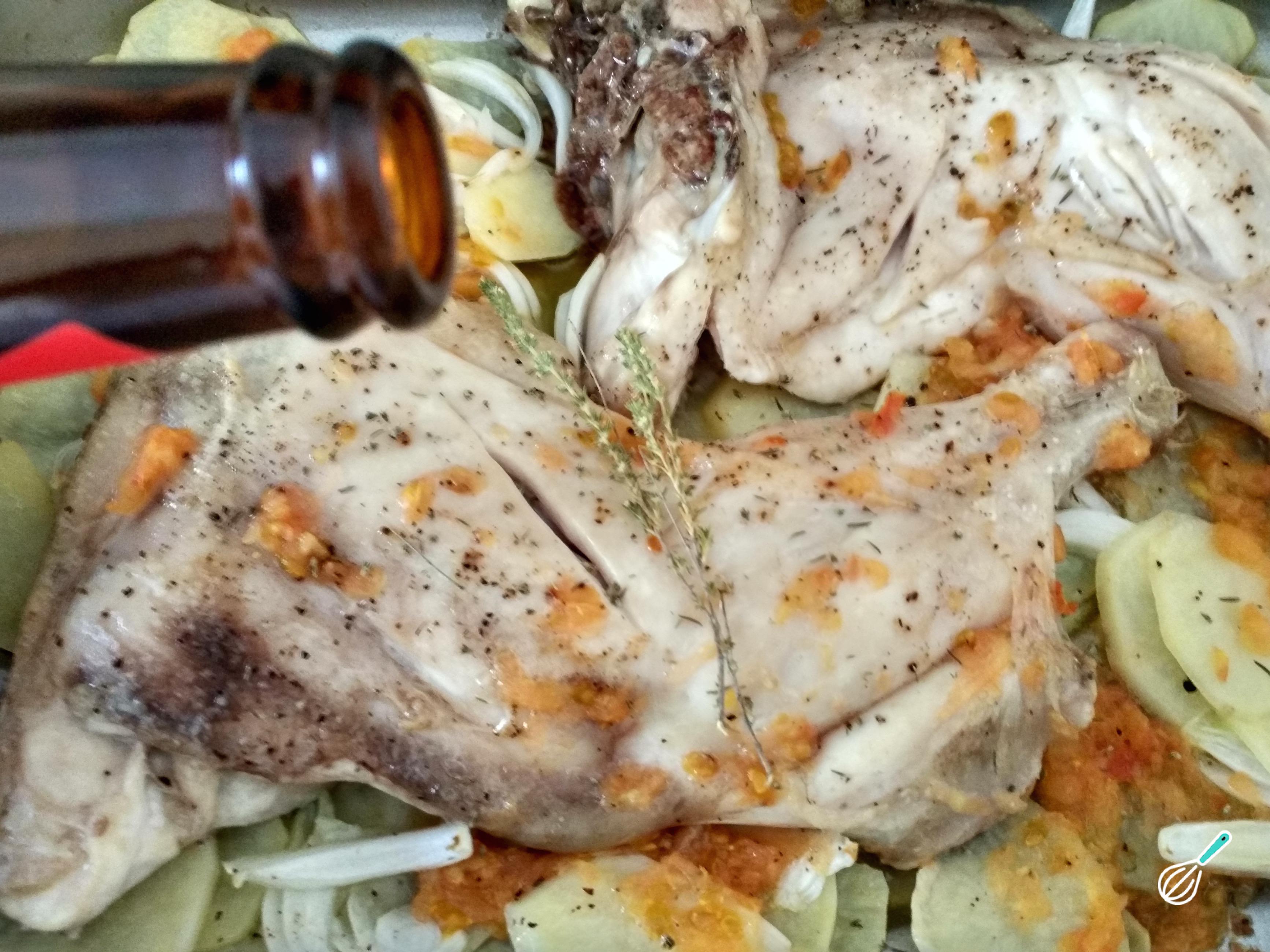 Passado esse tempo, junte a cerveja e o tomilho. Deixe o frango no forno por mais 35-40 minutos para assar completamente. Quando faltarem 5-10 minutos para terminar o cozimento, junte as alcachofras previamente cozidas e escorridas.