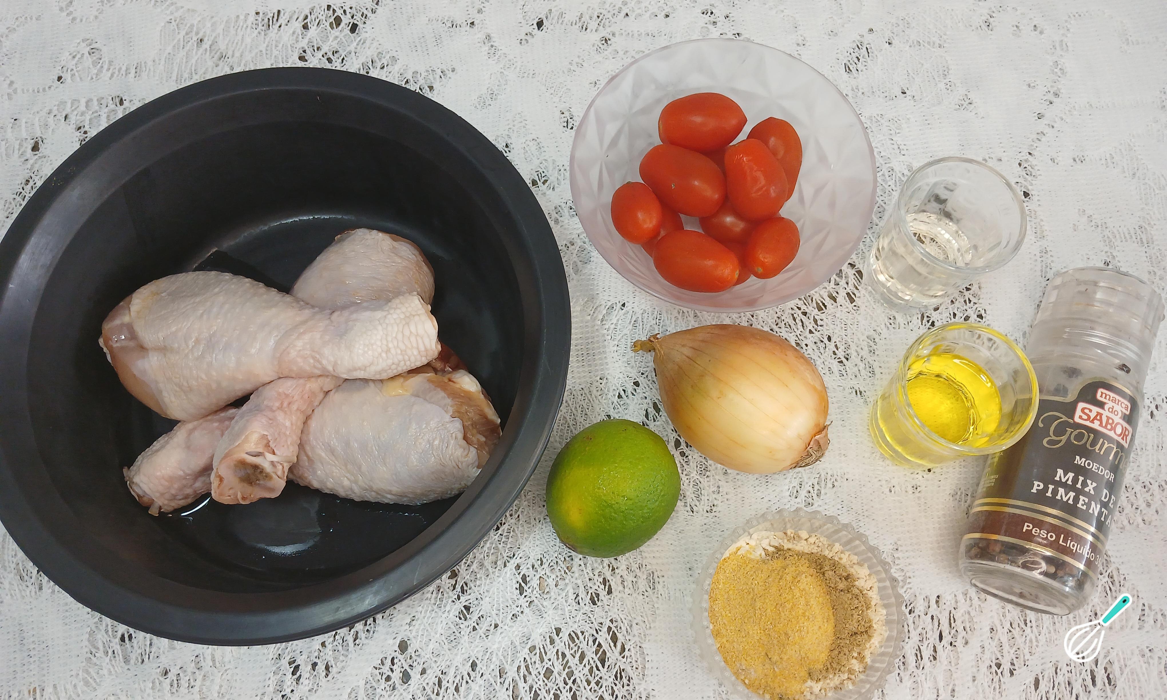 Comece separando os ingredientes para o preparo fo frango piri. Separe as coxas de frango, os tomates e a cebola. Separe os temperos que serão usados no preparo do frango, o limão e o vinagre.