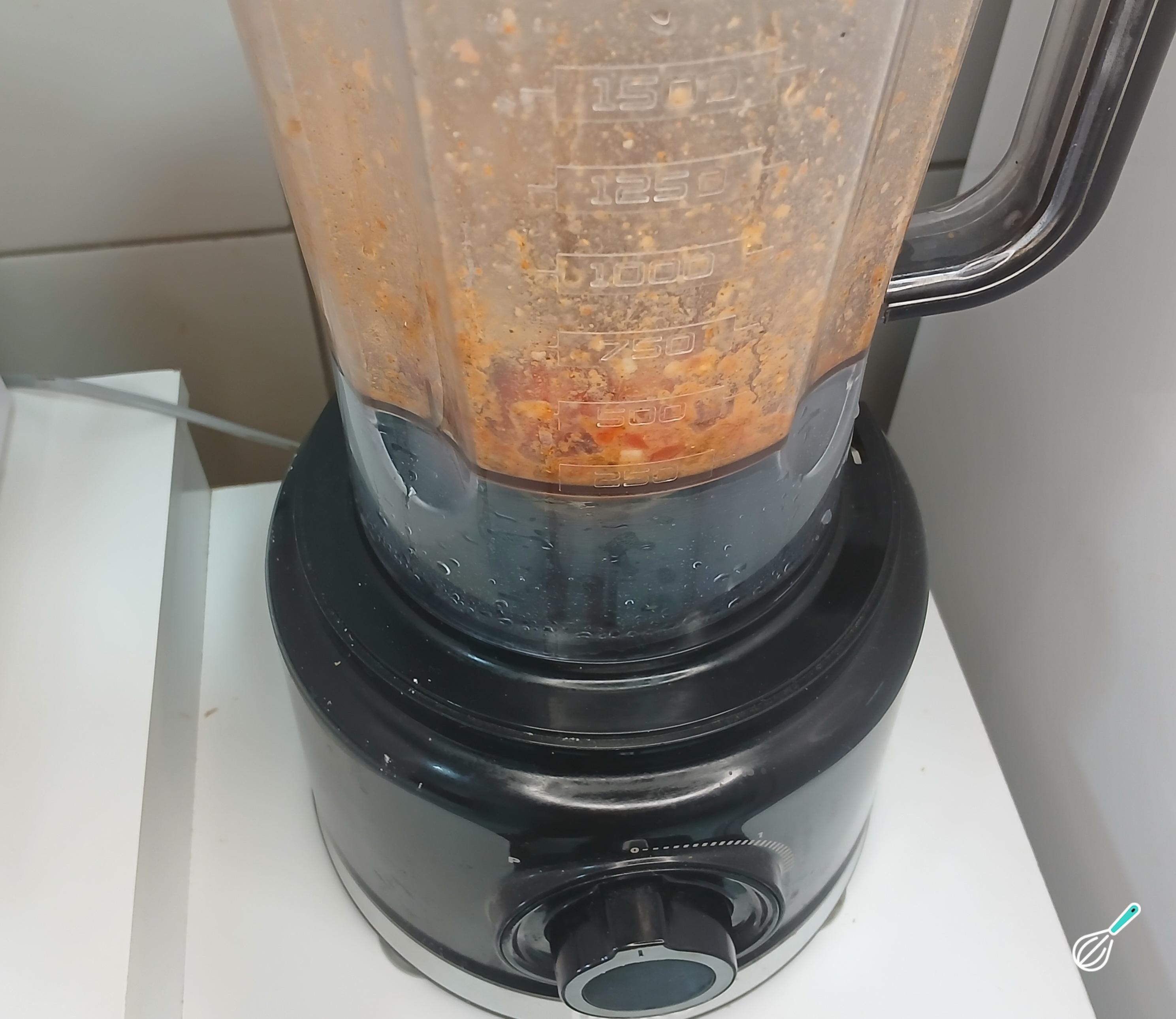Depois de desossar as coxas de frango, corte a cebola em lascas, e retire o suco do limão. Feito isso, leve ao liquidificador a cebola, os tomates, a pimenta, o suco de limão, o vinagre e o azeite. Bata tudo muito bem, até ficar bem homogêneo. Use o pulsar e não acrescente água ao preparo. Vá batendo até formar uma pastinha.