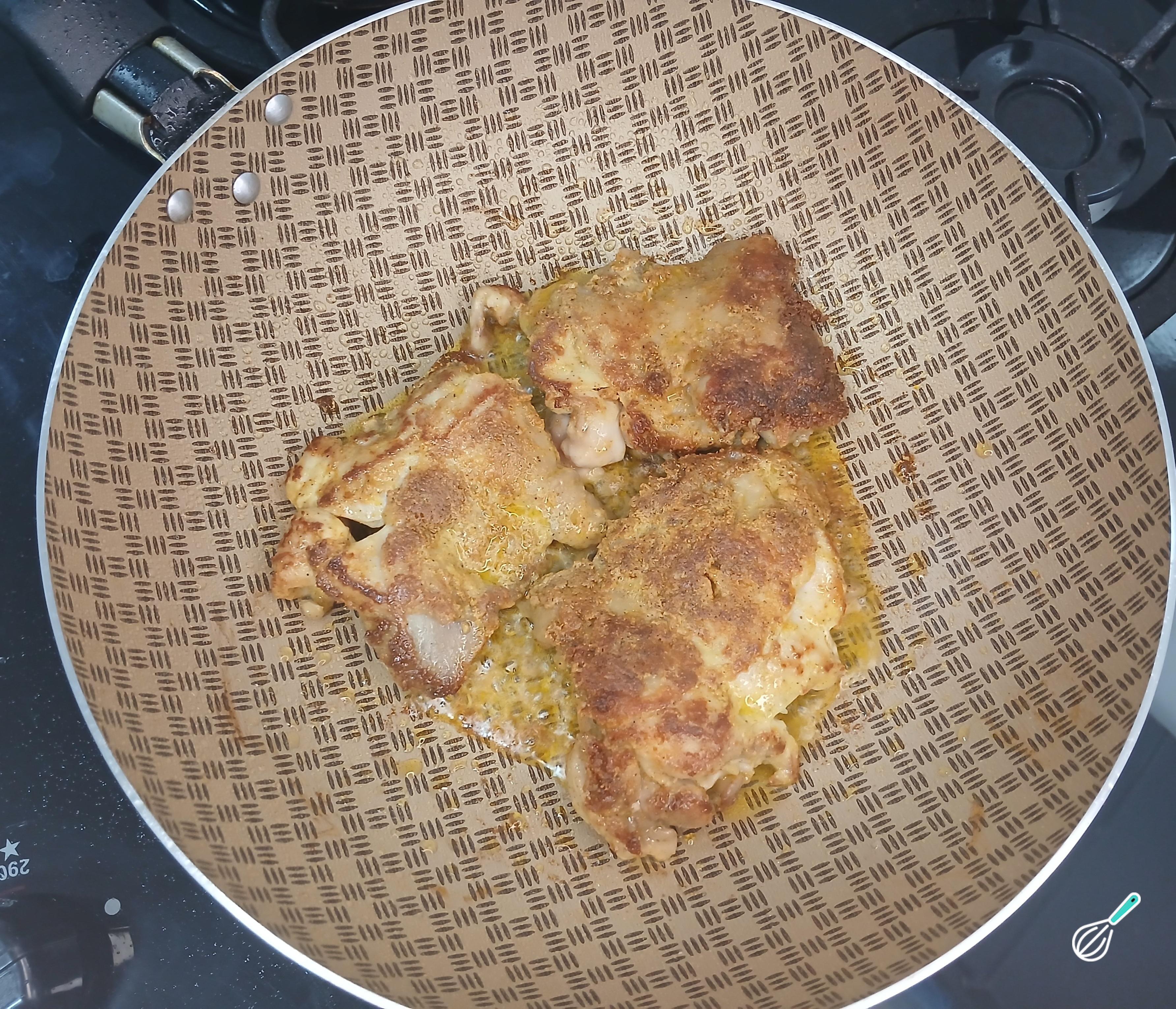 Em uma frigideira, aqueça o óleo e quando estiver bem quente coloque o frango com a pele para baixo para dourar. Deixe dourar dos dois lados. Mantenha o fogo baixo e vá colocando água aos poucos. Tampe a panela e deixe cozinhar um pouco.
