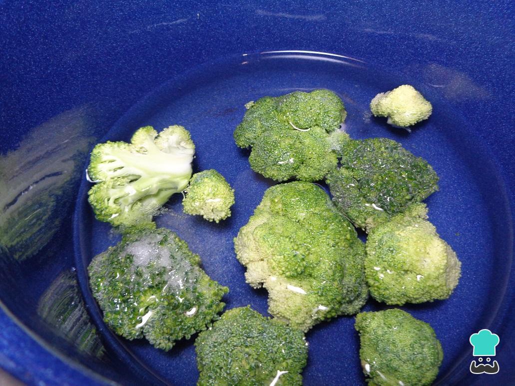Lave os brócolis e corte em pedaços pequenos. De seguida, coloque água em uma panela, os brócolis, tempere com uma pitada de sal e deixe levantar fervura. Depois de levantar fervura conte três minutos, retire os brócolis e reserve.