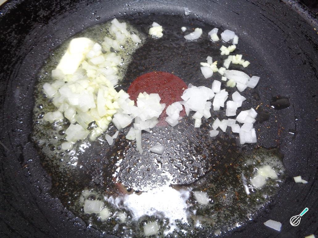 Em seguida pique finamente a cebola e o alho e refogue em uma frigideira com a manteiga.