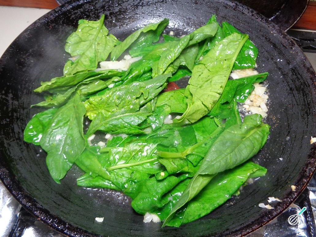 Quando a cebola estiver macia acrescente as folhas de espinafre lavadas e tempere a gosto com sal e pimenta. Deixe cozinhar até que murchem e desligue o fogo.