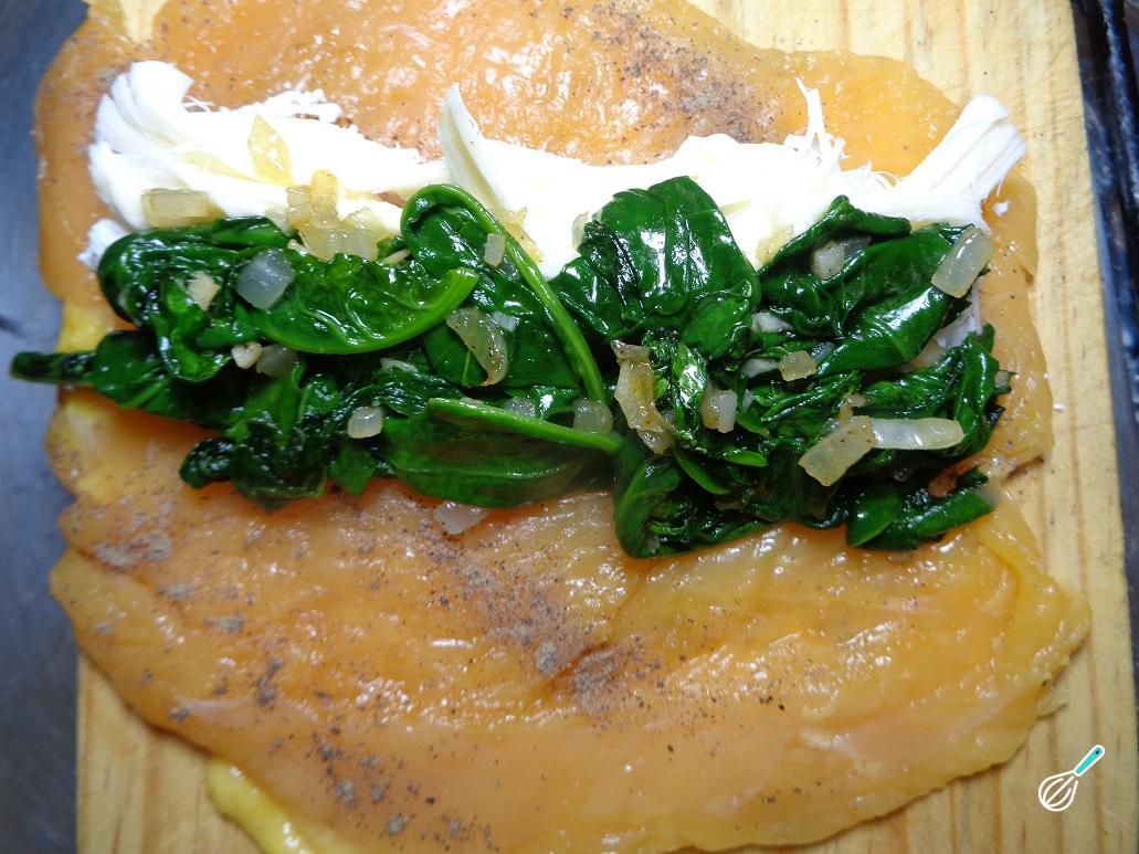 Para rechear os peitos de frango abra-os ao meio e tempere com sal e pimenta. Depois coloque ao centro um pouco de cream cheese, de queijo mussarela e dos espinafres e feche com a ajuda de palitos de madeira, de forma a manter o recheio no interior.