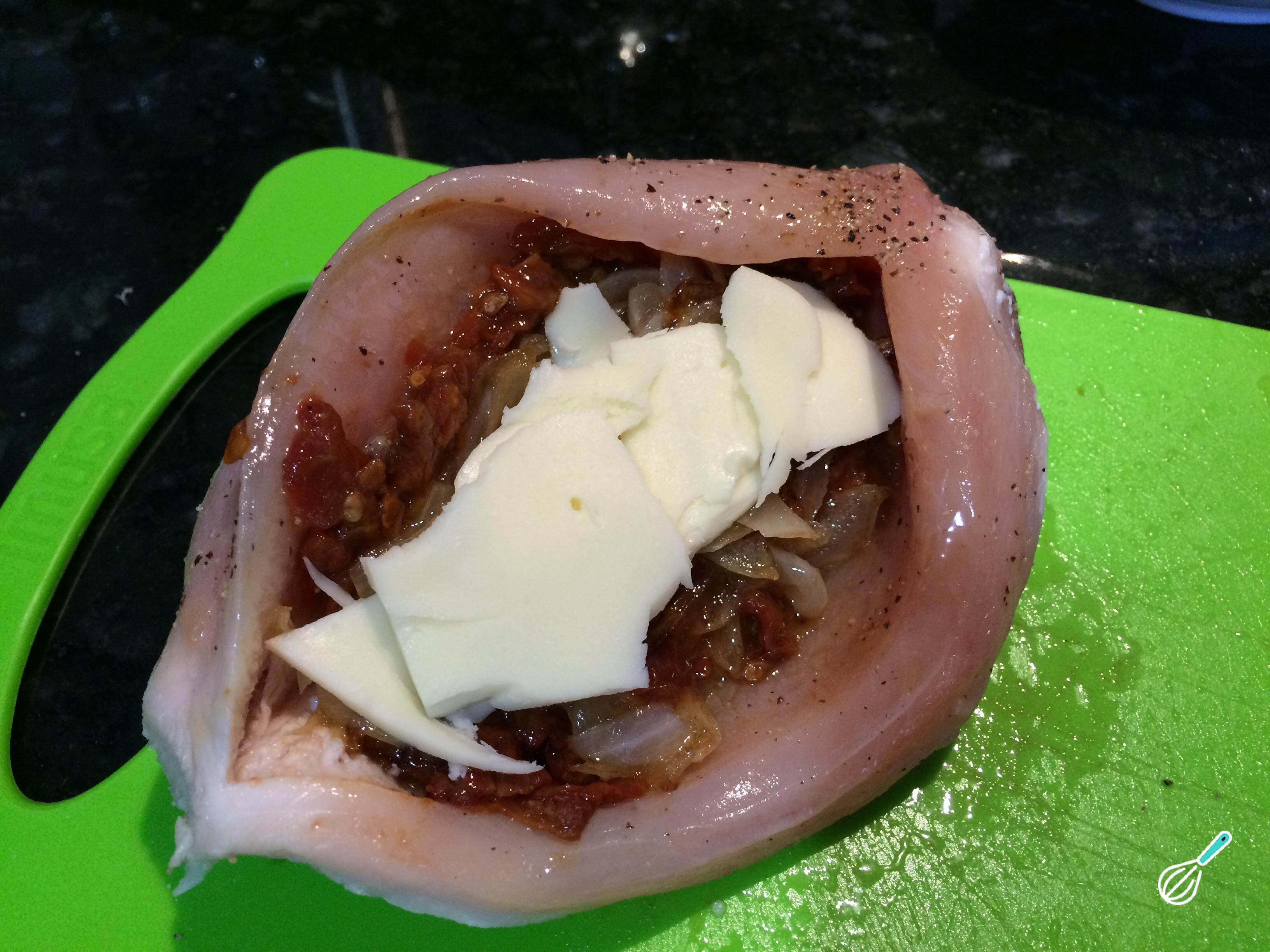 Faça um corte transversal no peito de frango, tempere por dentro e por fora com sal e pimenta, e recheie com os tomates hidratados e picados, a cebola caramelizada e a mussarela em pedaços.