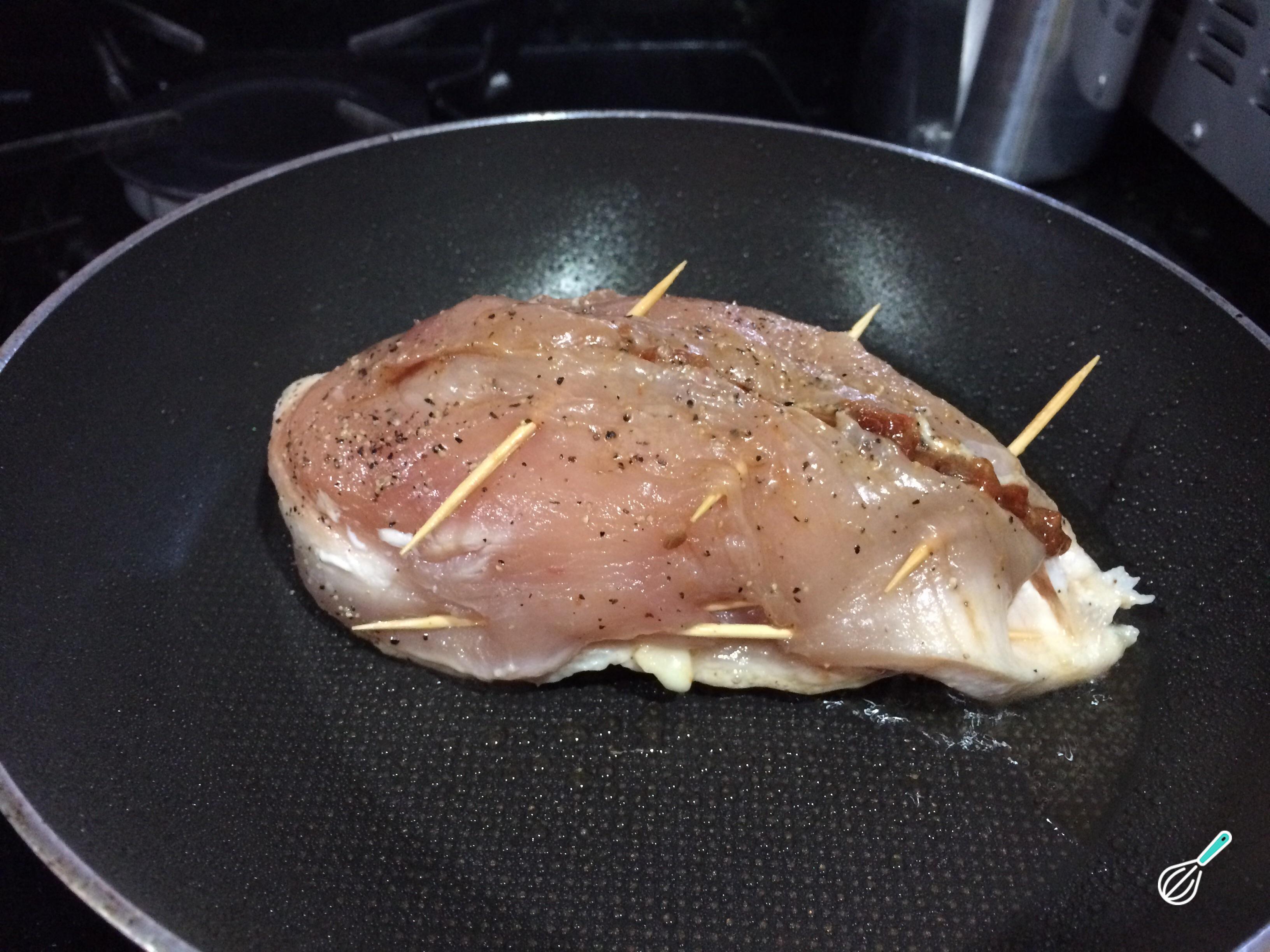 Feche o peito de frango recheado com palitos de dente e doure por todos os lados em uma frigideira com azeite.