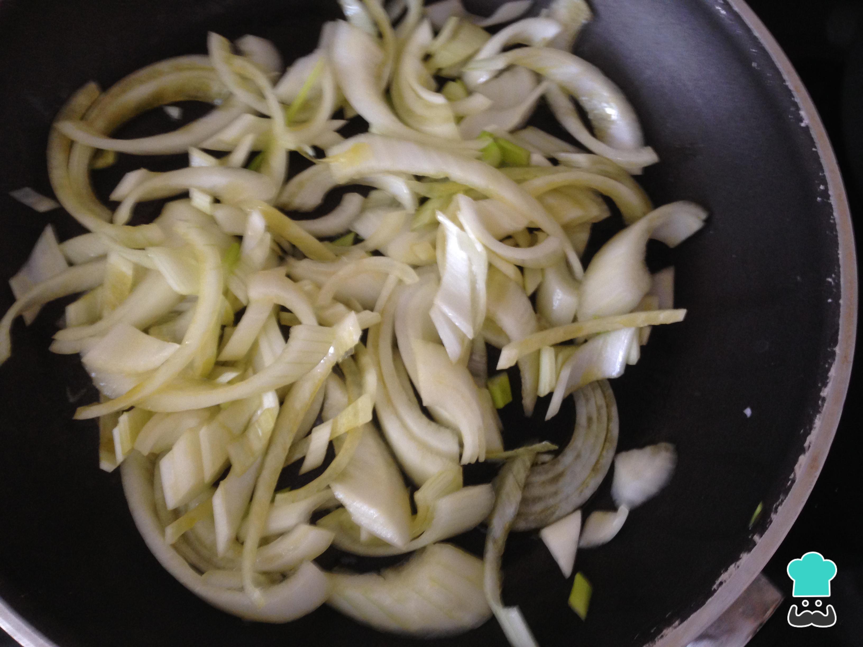 Em uma frigideira refogue a cebola cortada em juliana com azeite. Coloque uma pitada de sal e cozinhe por 4 minutos.