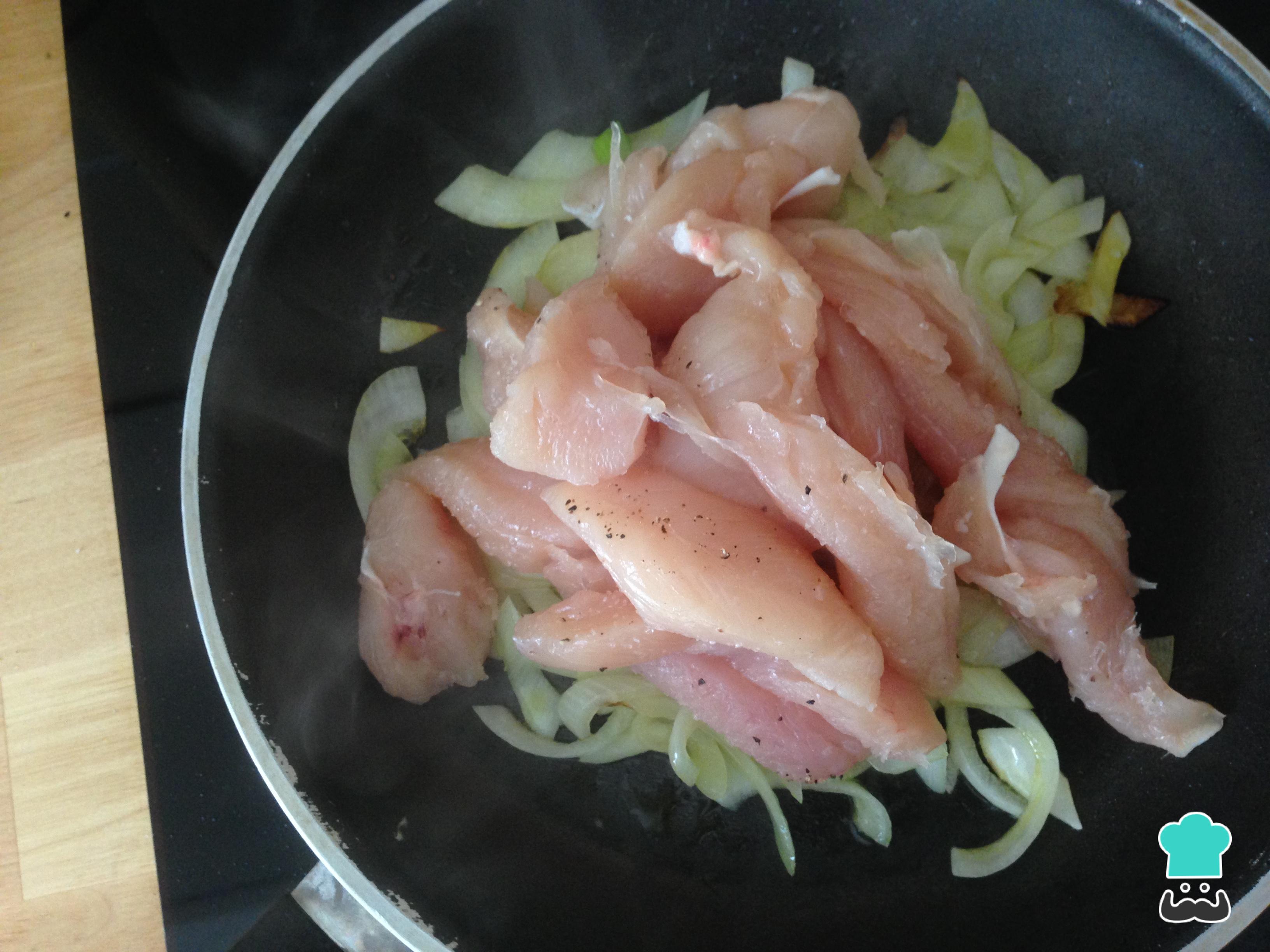 Em seguida, adicione o frango cortado em pedaços alongados, como na fotografia, tempere com sal e pimenta, e deixe cozinhar até dourar.