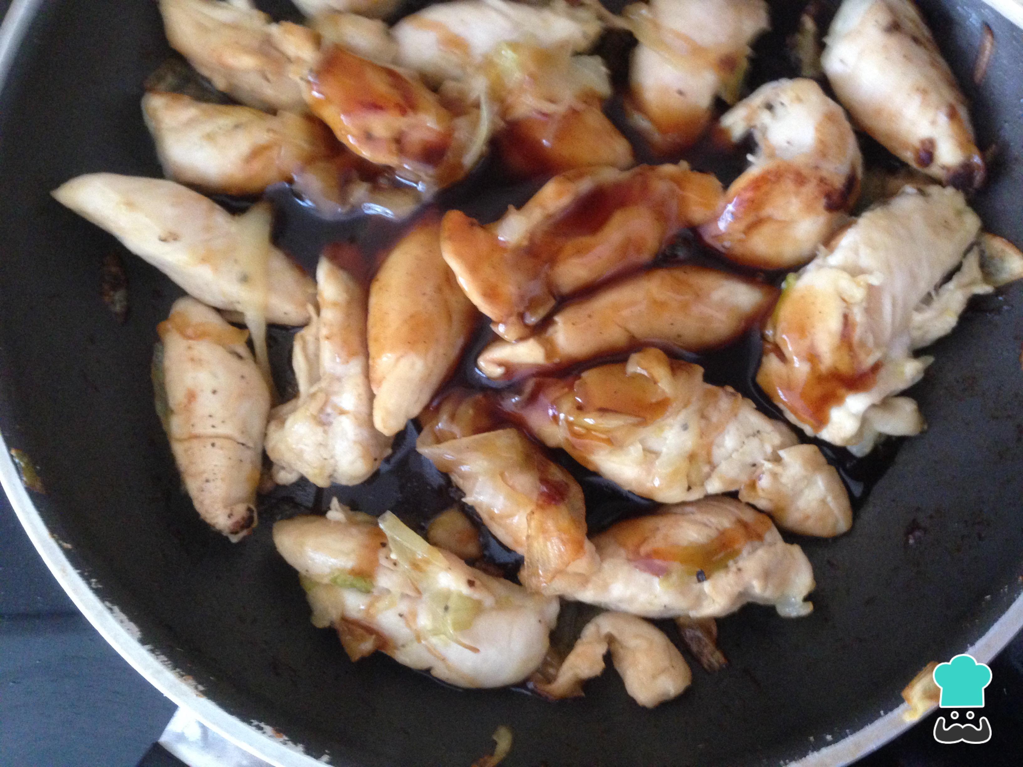 Acrescente o molho teriyaki ao frango e misture, para que todos os sabores se juntem. Se você quiser fazer o molho caseiro, pode seguir nossa receita aqui: molho teriyaki.