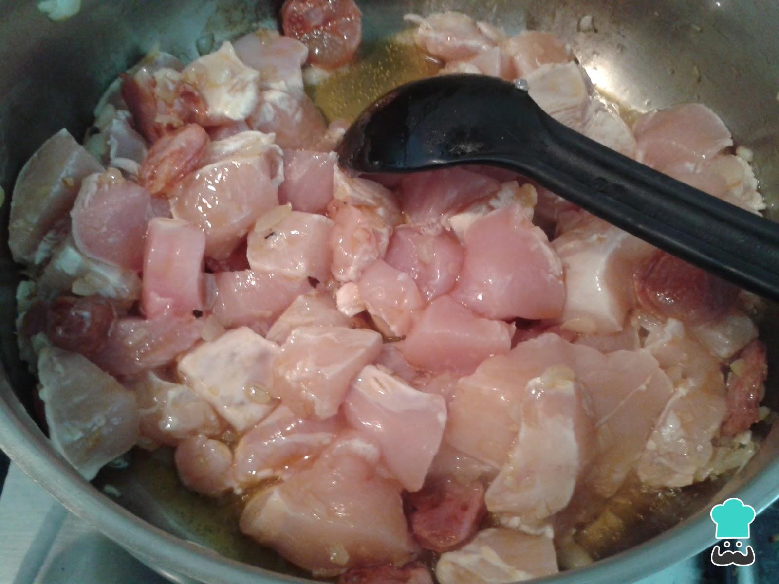 O primeiro passo do frango xadrez é colocar o óleo em uma panela wok ou frigideira antiaderente e cozinhar aí os cubos de frango até dourar.