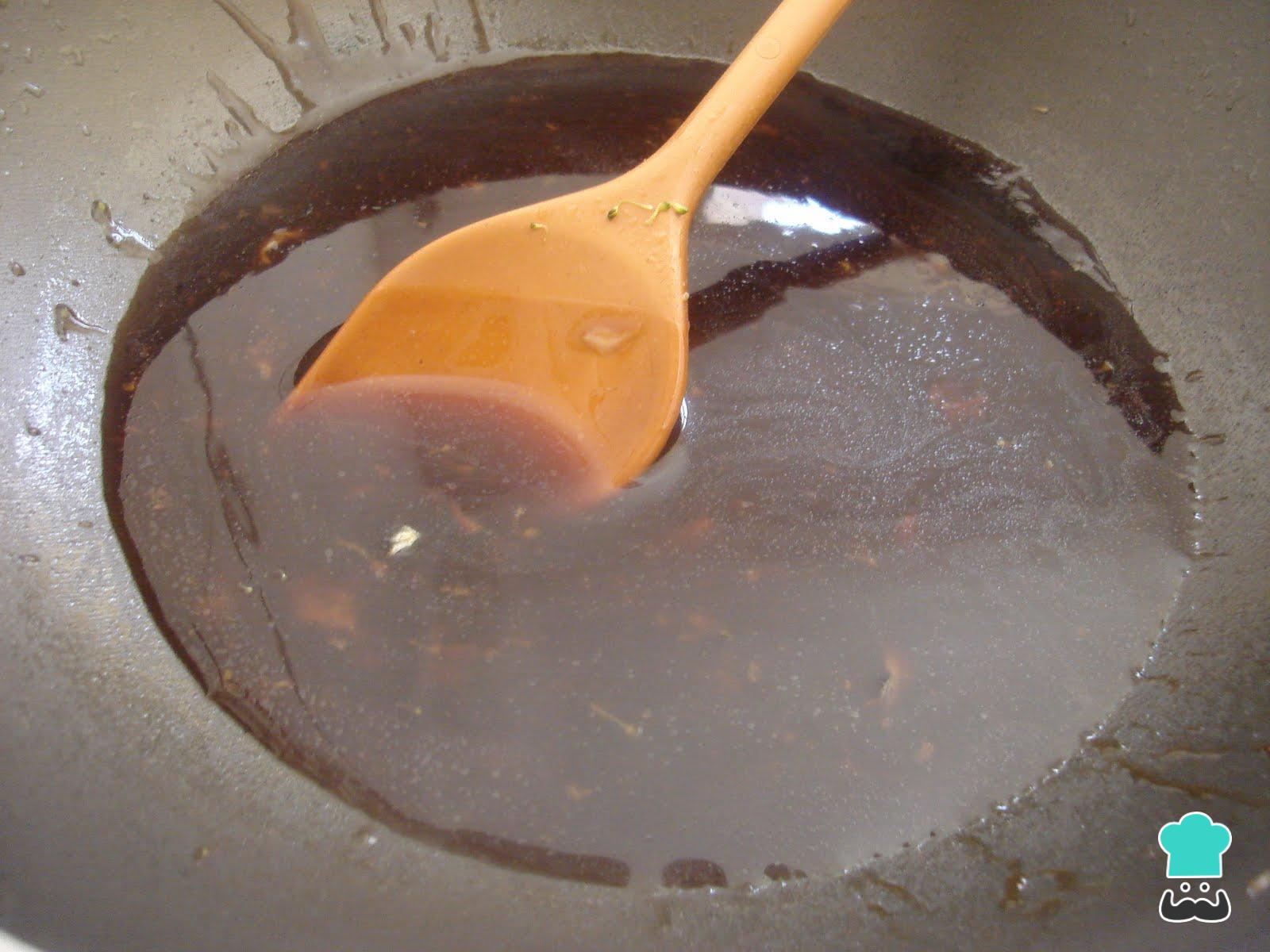 Desligue o fogo e transfira para uma tigela ou travessa grande. Prepare o molho do frango xadrez colocando os respetivos ingredientes a cozinhar em fogo médio na anterior frigideira. Mexa até engrossar.