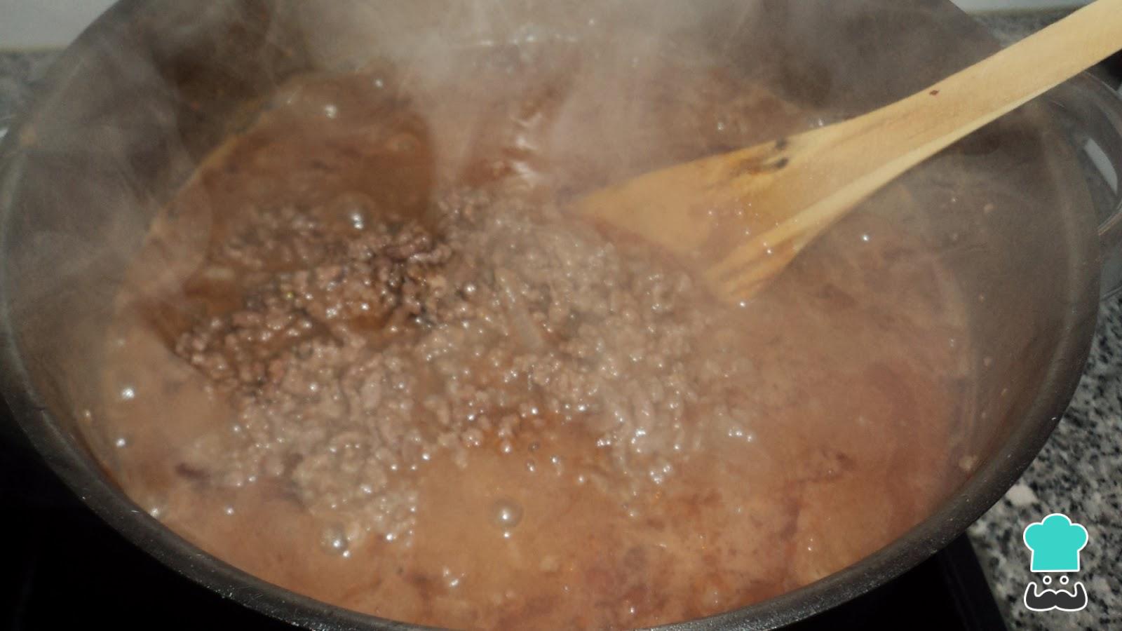 Para fazer fricassé de carne moída com creme de milho, comece picar a cebola. Leve uma panela com água ao fogo, deixe ferver e junte a carne moída e a cebola. Tempere com sal e pimenta a gosto e deixe cozinhar.