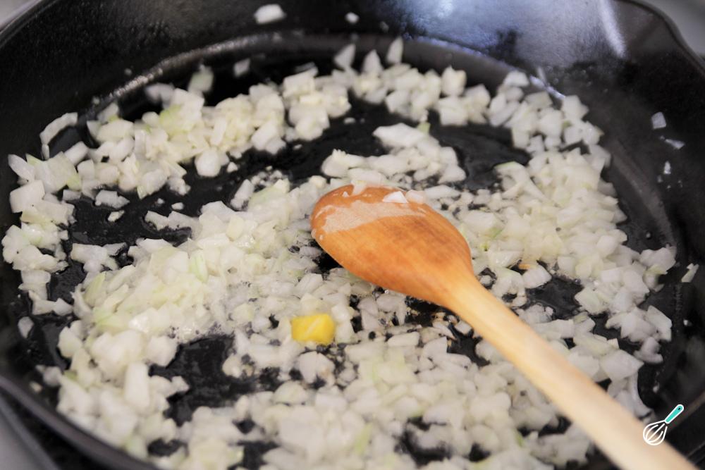 Em seguida prepare um refogado: leve ao fogo médio-baixo uma panela com a manteiga e a cebola picada e deixe cozinhar até dourar. Acrescente o frango e o extrato de tomate e misture.