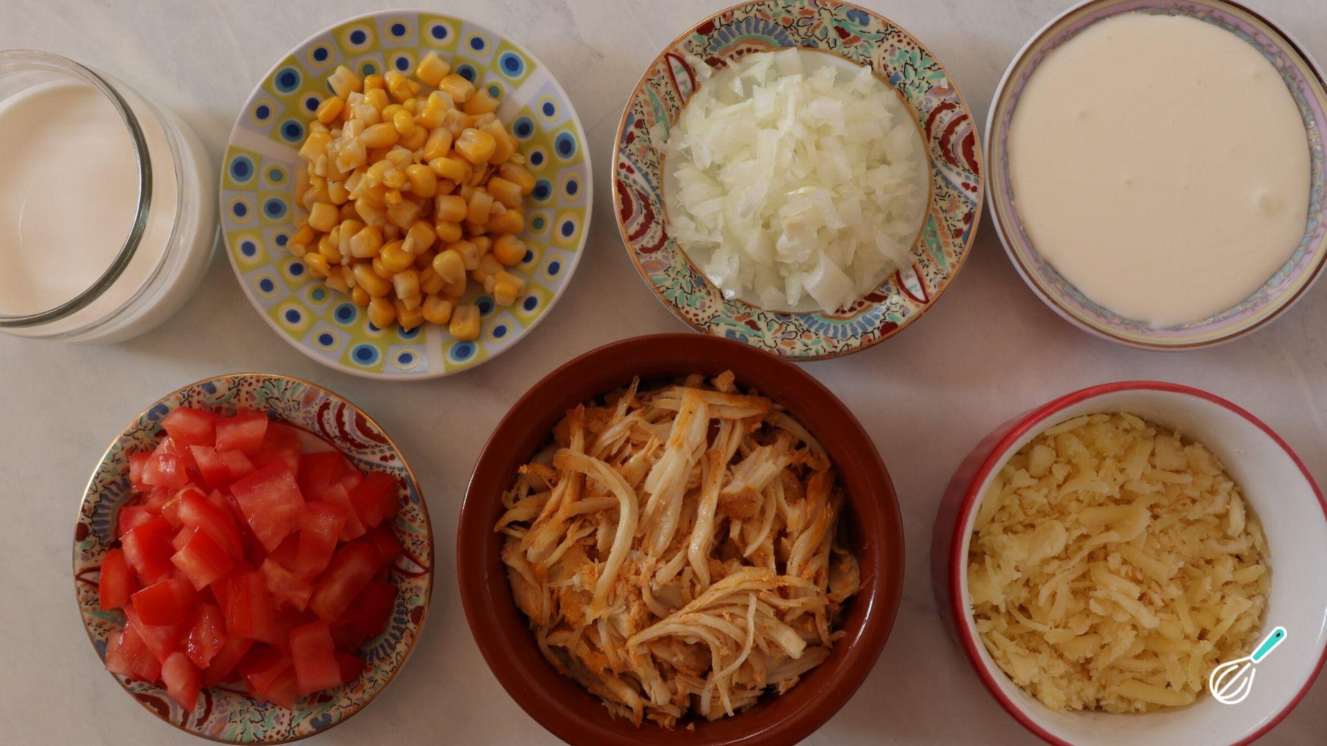 Separe os ingredientes. O frango já deve estar cozido, temperado e desfiado. Caso você já não tenha esse ingrediente pronto aí na sua geladeira é só dar uma olhada nesta receita de frango desfiado e cozido.