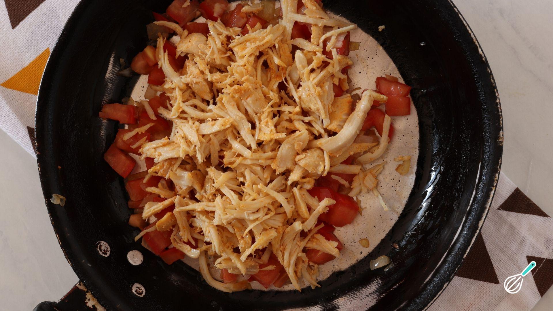 Em seguida acrescente o frango cozido e desfiado e misture com esses temperos.