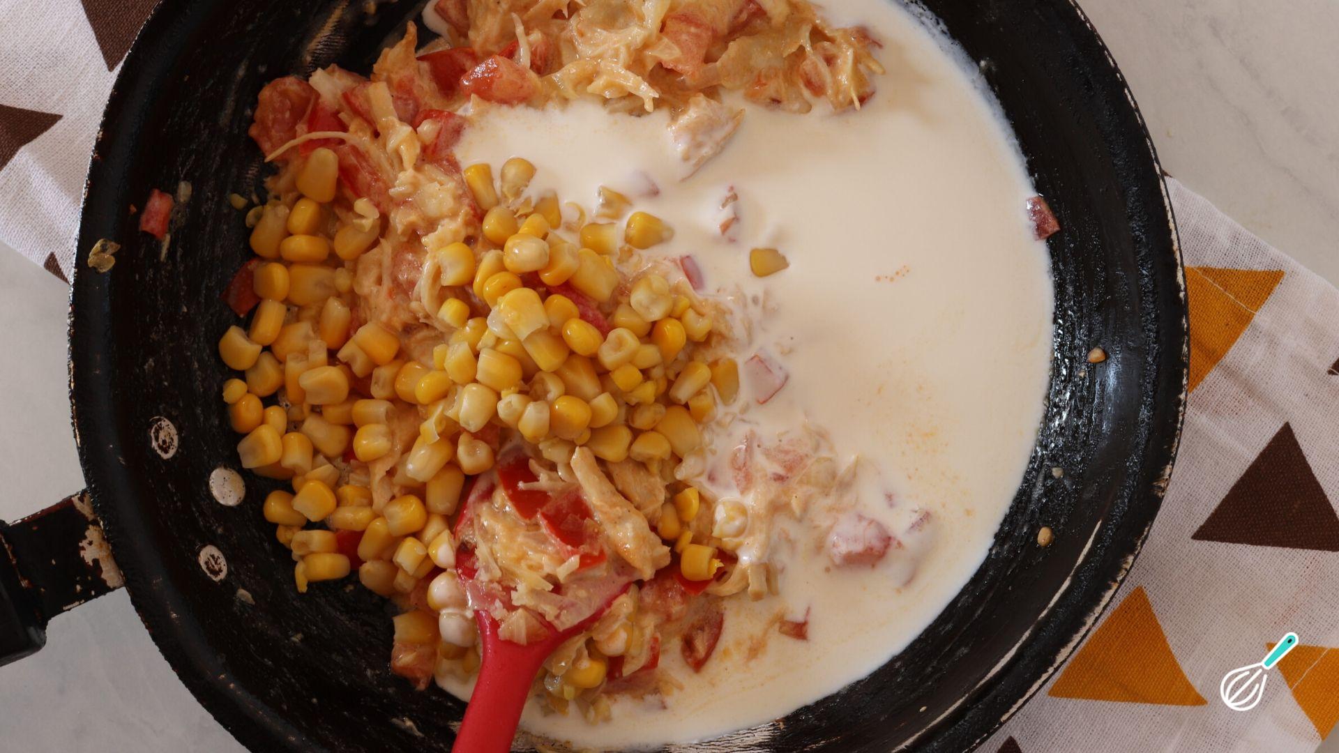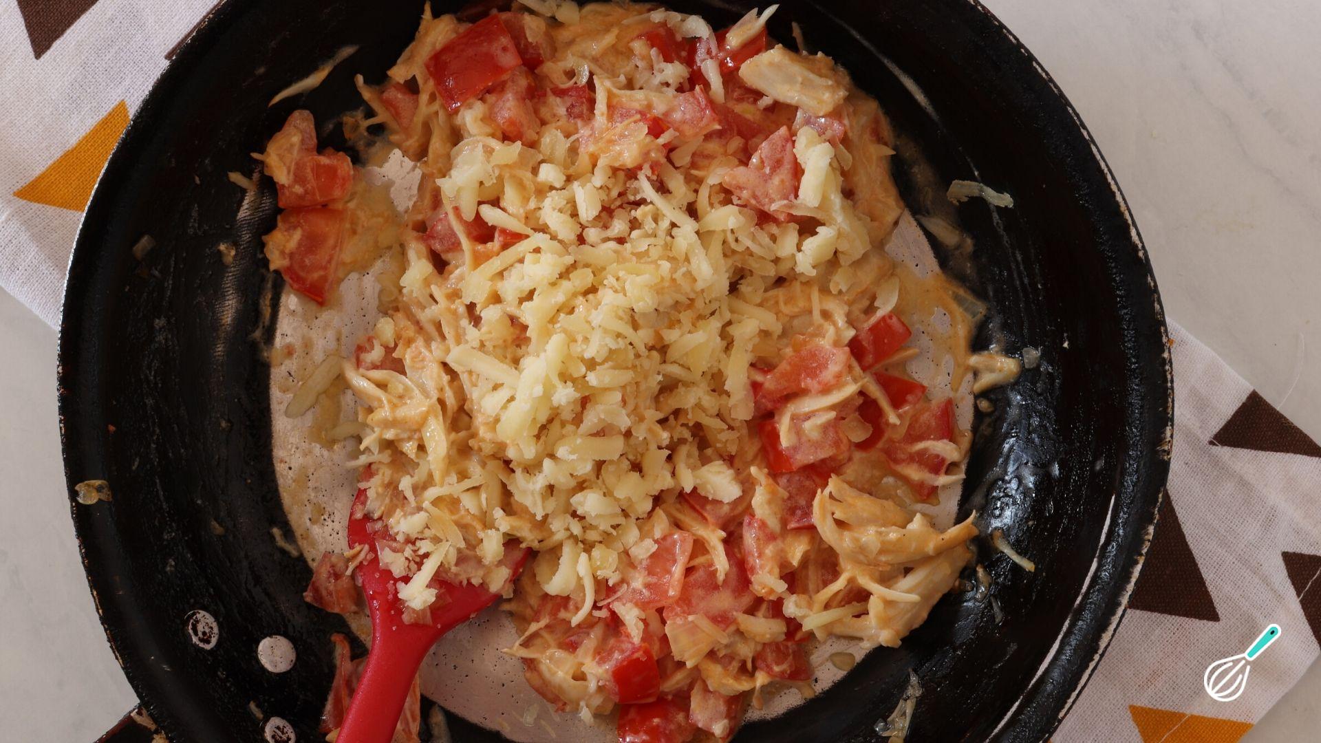 Coloque também o requeijão e a muçarela ralada. Misture e deixe pegar gosto por mais ou menos 2 minutos.