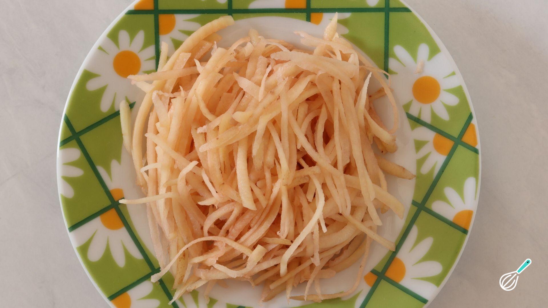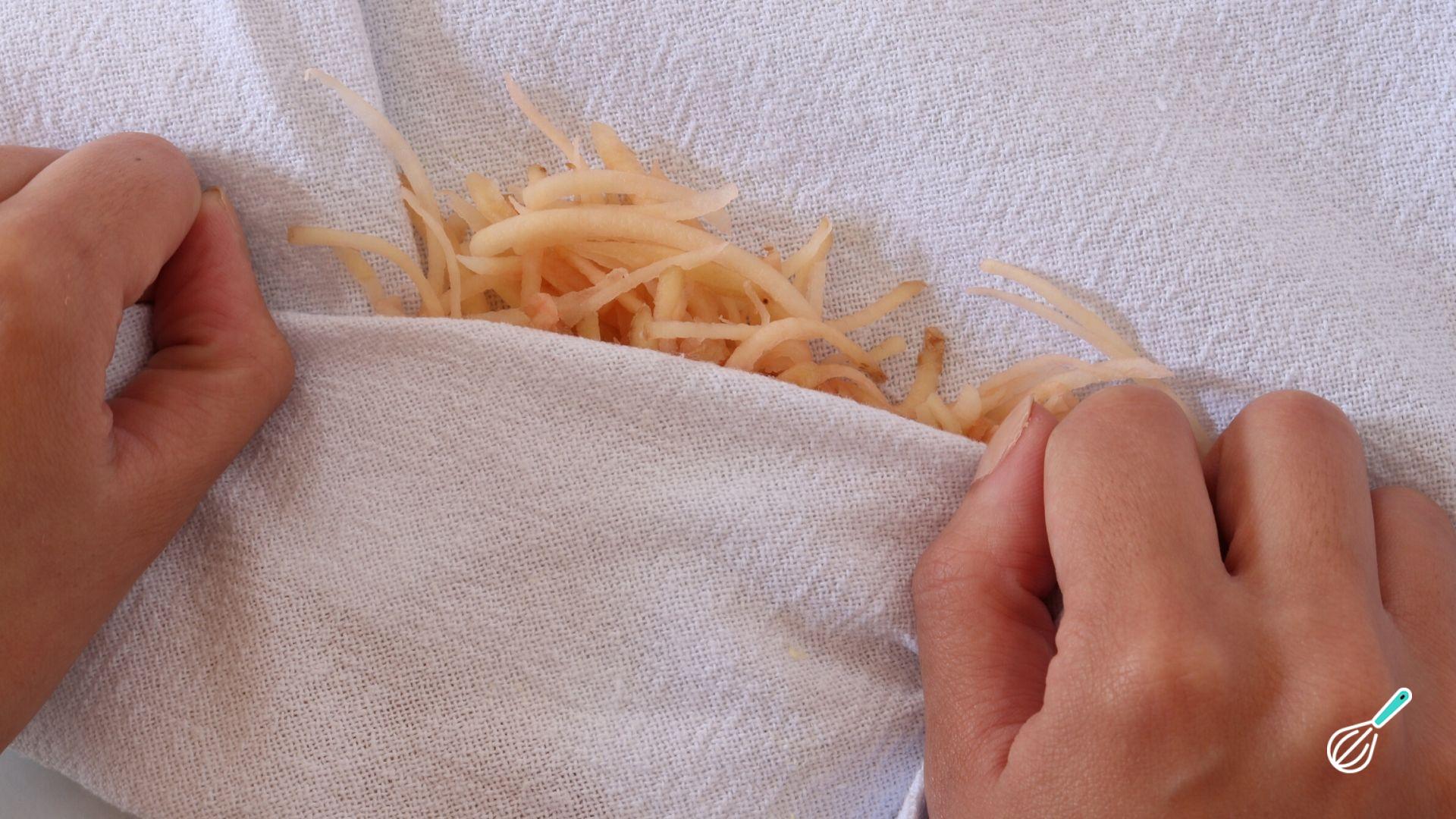 Atenção nessa parte: para dar certo, é necessário deixar a batata bem sequinha. Então, depois de ralar, pegue um pano de prato limpo e seque a batata pressionando o pano.