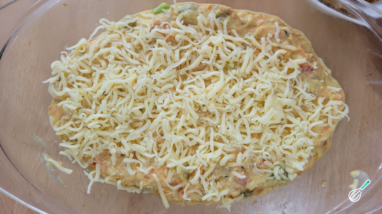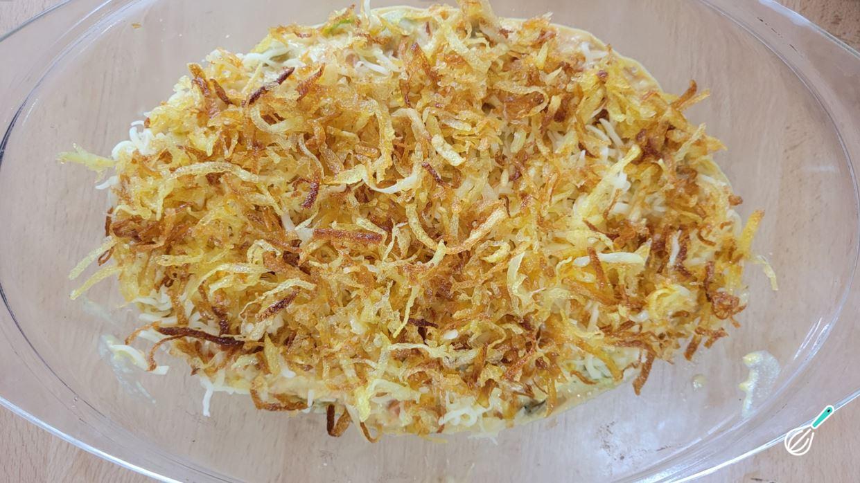 Cubra com a batata palha e leve ao forno pré-aquecido a 180oC por cerca de 15 minutos ou até que esteja borbulhando.