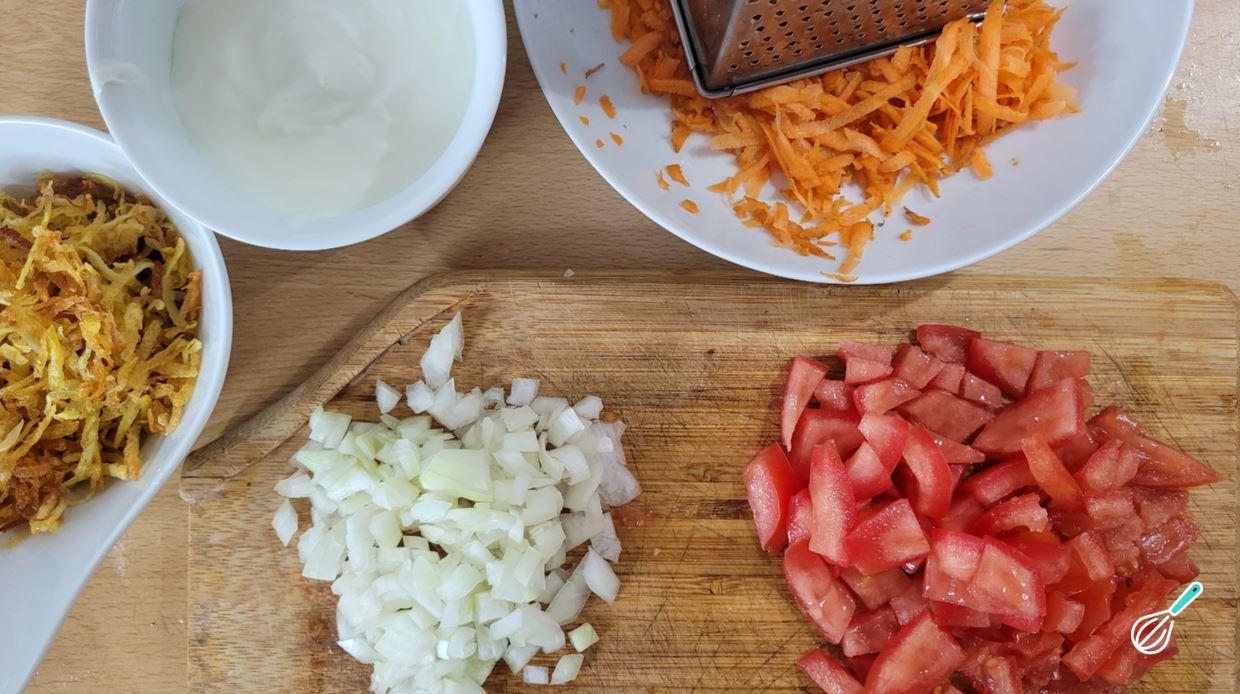 Corte a cebola e os tomates em cubinhos e rale as cenouras.